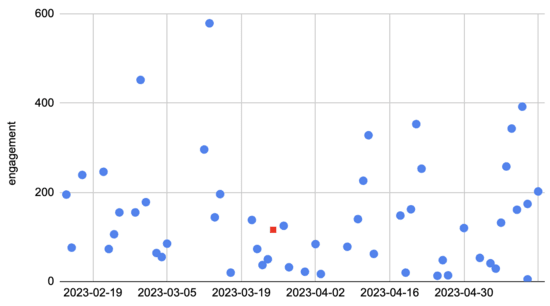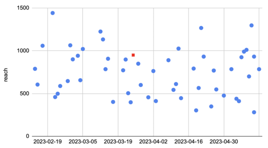 I was curious about what effect this had, but I didn't seem to have a way to tell. Recently I remembered that I had turned on professional mode on my profile, which meant that if I went into "Professional dashboard / Insights / Content" I could see my last three months of posts with their "reach" and "engagement" counts. Here are the plots: