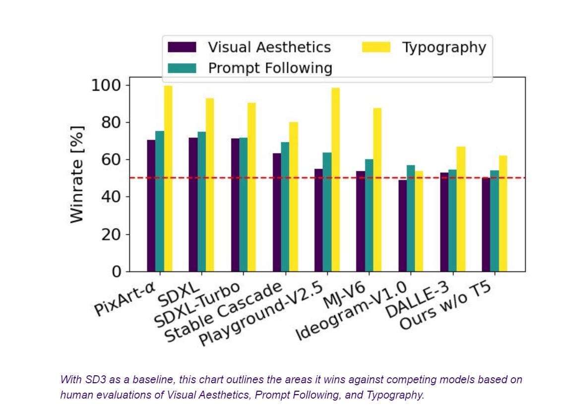 The Stanford Stable Diffusion 3 paper was released, showing the upcoming open-source model to be competitive with current SOTA commercial models. SD3 is expected to be the first model to reliably spell words correctly.