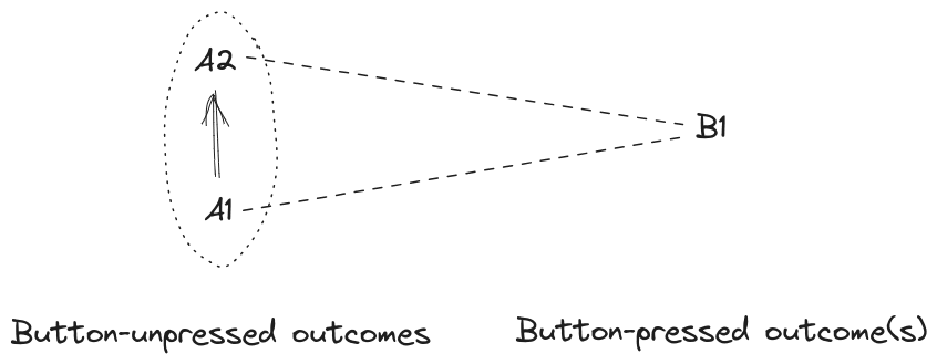 Looking back at our diagram with A1, A2, and B1, we could imagine a set of incomplete preferences which prefers A2 over A1, but has no preference between B1 and either of the A’s (i.e. the agent won’t spend resources to switch between button-unpressed and button-pressed outcomes, or vice versa). But this agent will spend resources to turn A1 outcomes into A2 outcomes.