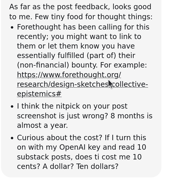 Well that's unfair; these aren't "cherry-picks", they're just the first four or five corrections the tool gave. And that comment wasn't "wrong", it's me screenshotting the tool's output and asking him whether the AI was accurate, because I'm trying to test out the v0.1 of a product I coded in the last five days. Here's another comment I left about the Japan post that led to a correction before this post went out.