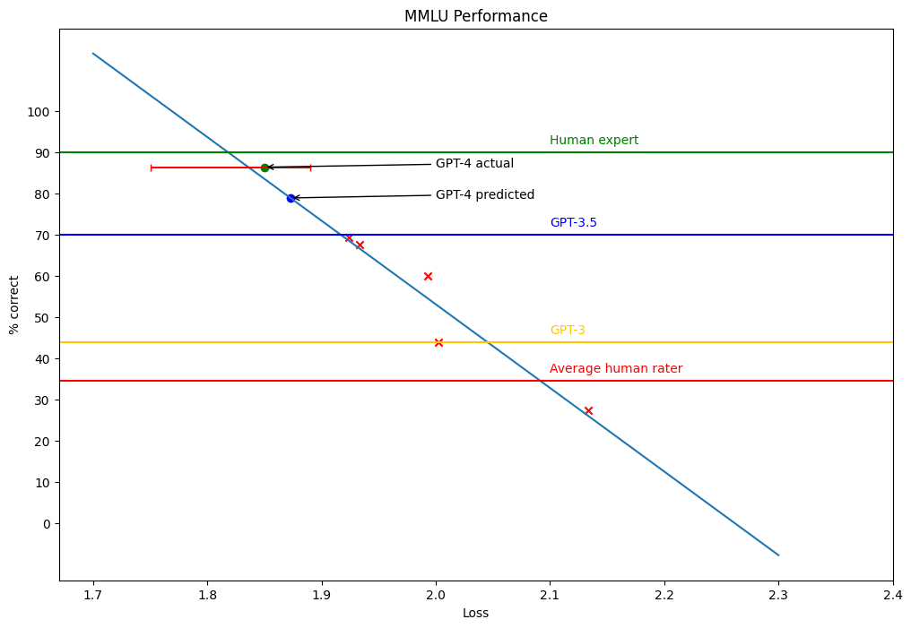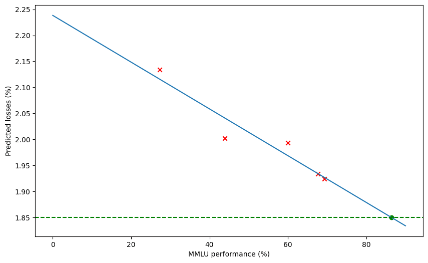 In the previous post, I created a linear correlation between loss and MMLU performance. I used the same dataset to create the opposite model: MMLU to loss. Given that GPT-4's performance was 86.4% on MMLU, we can use the model to estimate that GPT-4's cross-entropy loss per word is about 1.85 (which is lower than my predicted value of 1.87).