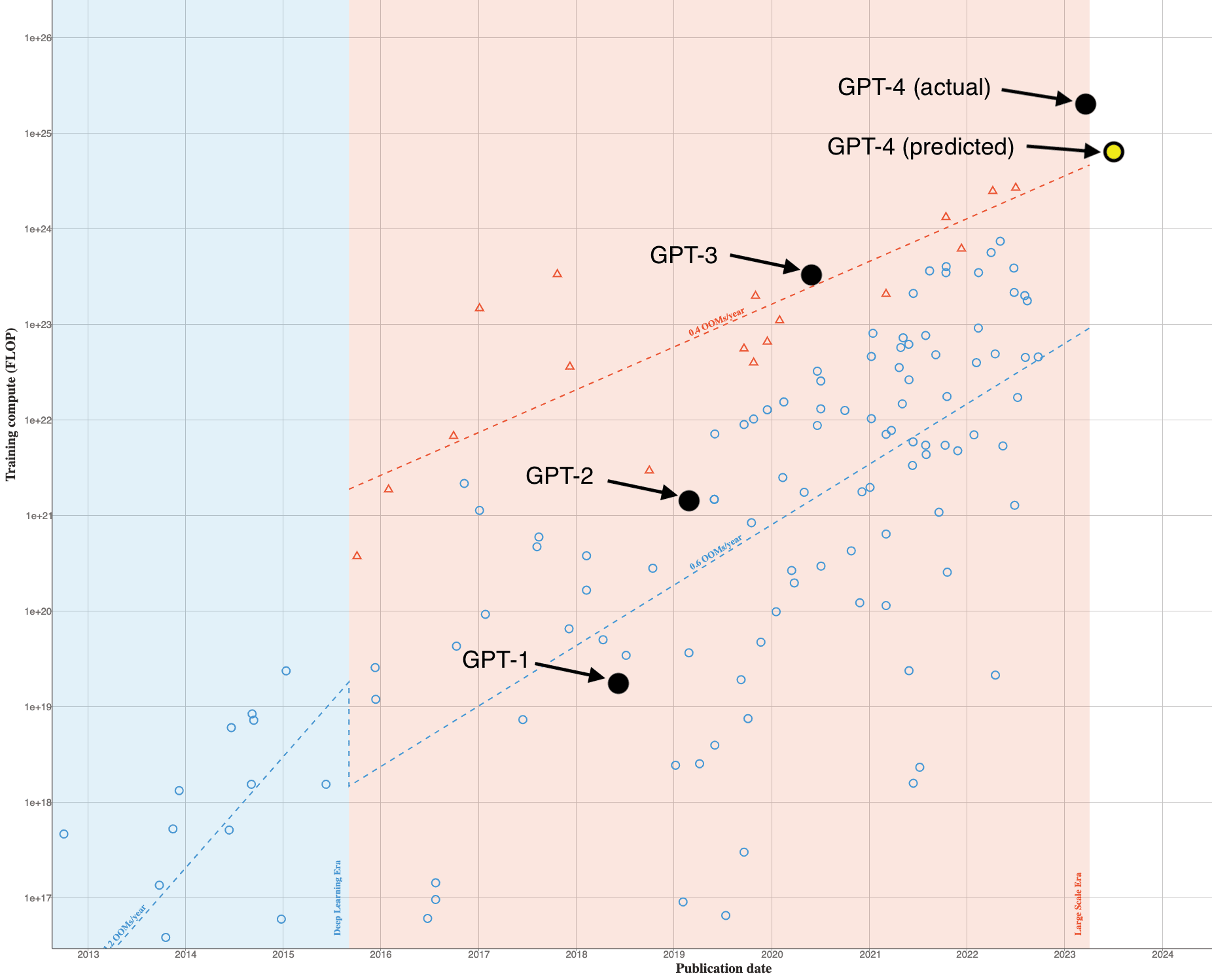 I originally predicted that GPT-4 would use about 5.63e24 FLOP of compute. According to EpochAI, the true value is about 2.2e25 which is about 4x my original estimate. The chart below also shows how GPT-4 came out earlier than I expected.