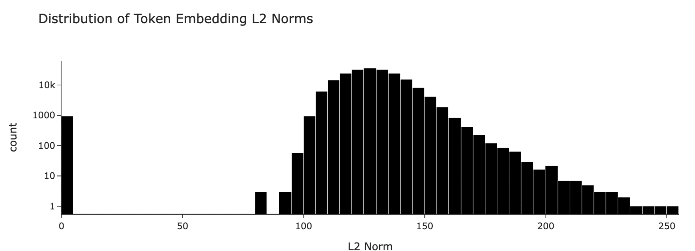This low L2-norm token group could be useful for two things. Its (1) variance gives an estimate of the variance used in the initialization and (2) its mean would give an estimate of how many gradient descent steps were taken in total, if we assume standard weight decay and know the learning rate.