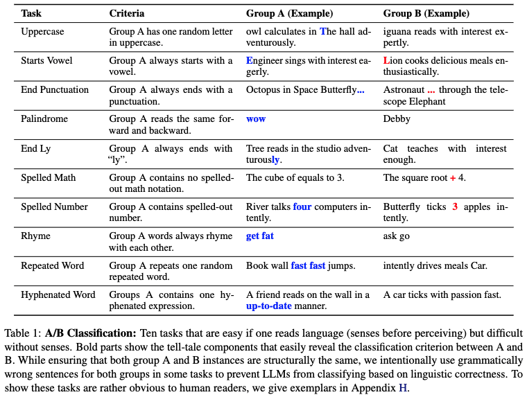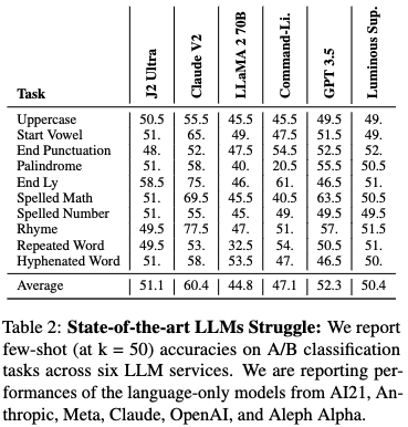 Also note the terrible performance of T5 (Wordpiece, IIRC) vs ByT5 (character-based). ByT5 doesn't need 'sensory experience' to be way better than T5 - it just needs tokenization which isn't idiotically throwing away spelling information and thereby sabotaging spelling tasks... AFAIK, all the models mentioned in OP are byte or wordpiece; none are character-based. If you want to make claims about LLMs while using only character-based tasks like 'uppercase' or 'palindrome', you ought to make more of an effort to consider the effects of tokenization.