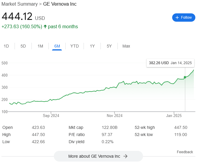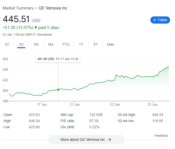 The latest growth spurt started January 14th, well before the Stargate news went public, and this seems like just its straight-line continuation. The graph past the Stargate announcement doesn't look "special" at all. Arguably, we can interpret it as Stargate being part of the reference class of events that are currently driving GE Vernova up – not an outside-context event as such, but still relevant...