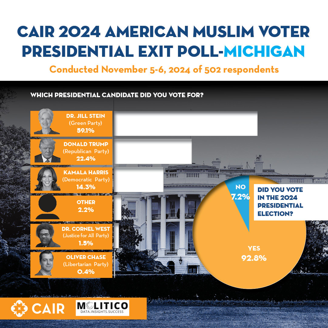 We know that Dearborn is ~50% Muslim. Stein got 18% of the vote there, as opposed to the minimum 30% implied by the CAIR exit polls. Also, there are ~200,000 registered Muslim voters in Michigan, but Stein only received ~45,000 votes. These numbers don't quite add up when you consider that the Green party had a vote share of 0.3% in 2020 and 1.1% in 2016, long before Gaz...