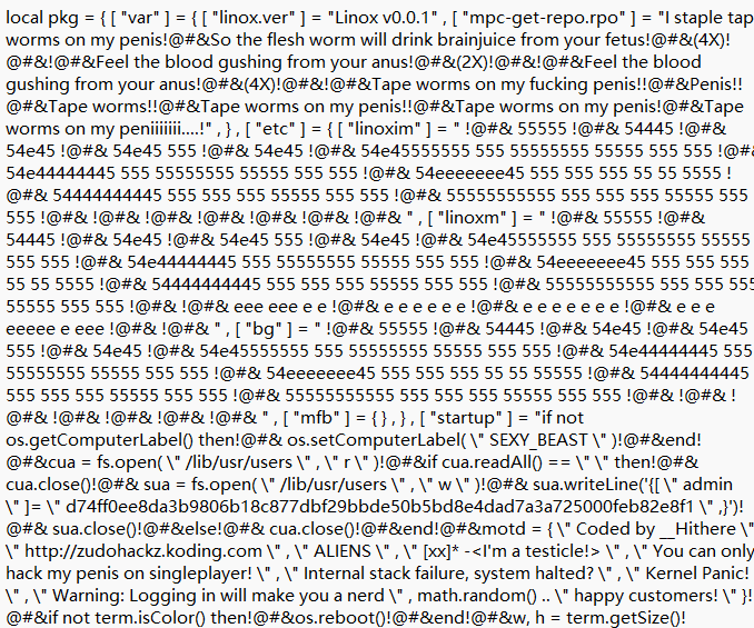 It looks like Minecraft stuff (like so much online). "GravityScore" is some sort of Minecraft plugin/editor, Lua is a common language for game scripting (but otherwise highly unusual), the penis stuff is something of a copypasta from a 2006 song's lyrics (which is a plausible time period), ZudoHackz the user seems to have been an edgelord teen... The gibberish is perhaps Lua binary bytecode encoding poorly to text or something like that; if that is some standard Lua opcode or NULL, then it'd show up a lot in between clean text like OS calls or string literals. So I'm thinking something like an easter egg in a Minecraft plugin to spam chat for the lolz, or just random humor it spams to users ("Warning: Logging in will make you a nerd").