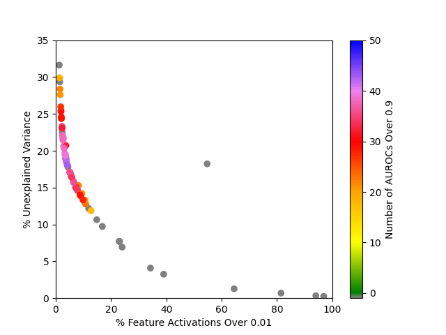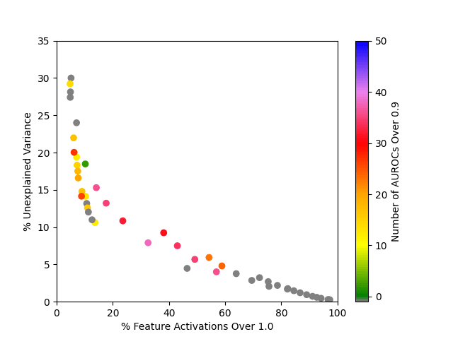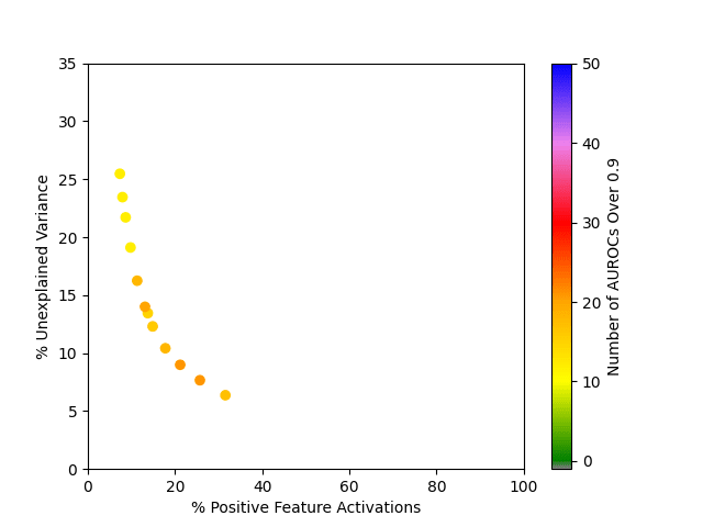 Out of those trained with ϵ=0 as in Makhzani and Frey and Gao et al, the best one found 34 good classifiers. It was trained with k=85 and also had on average 13.2% unexplained variance. Notably, all of the SAEs trained with ϵ>0 had no dead neurons, whereas all of the SAEs trained with ϵ=0 had a significant number of dead neurons; the one trained with k=85 had 15.1% dead neurons.