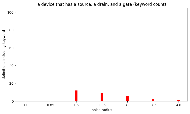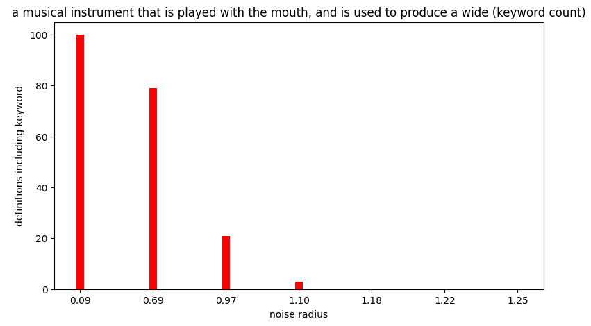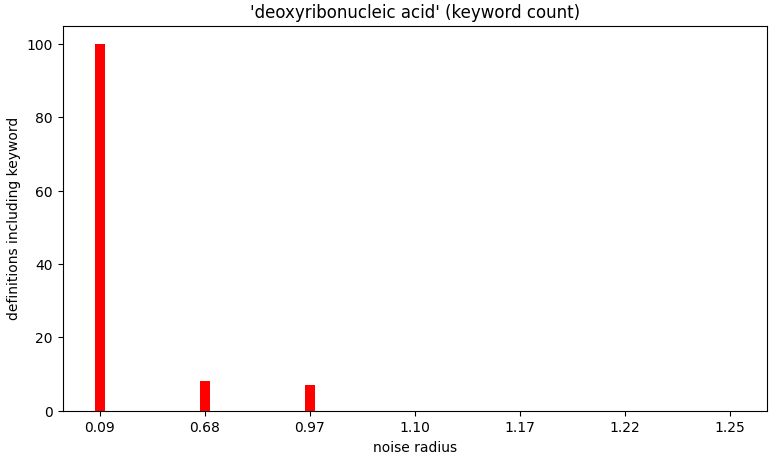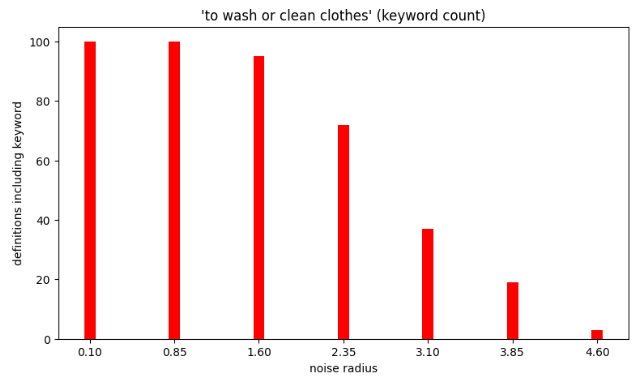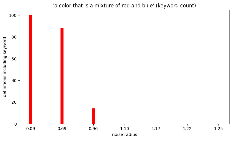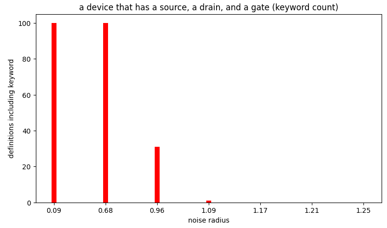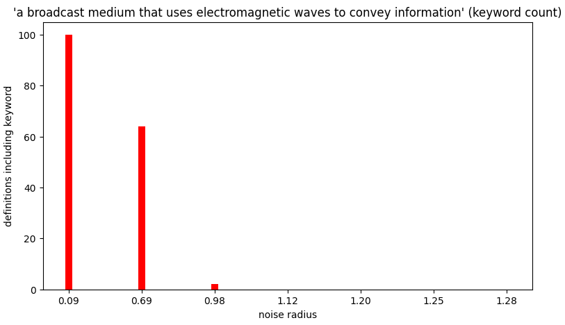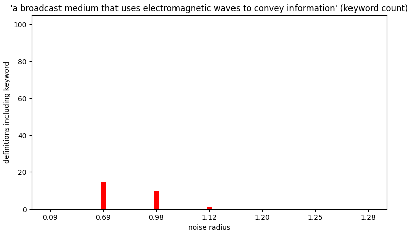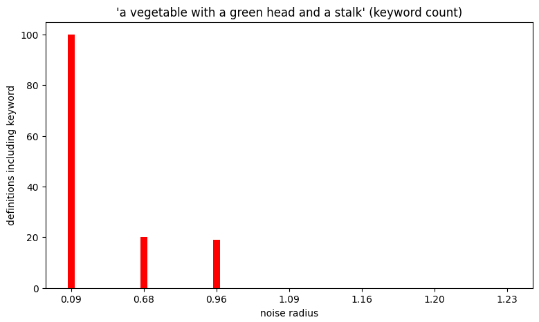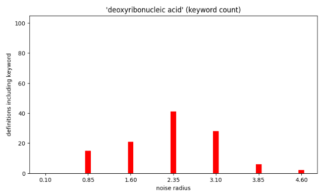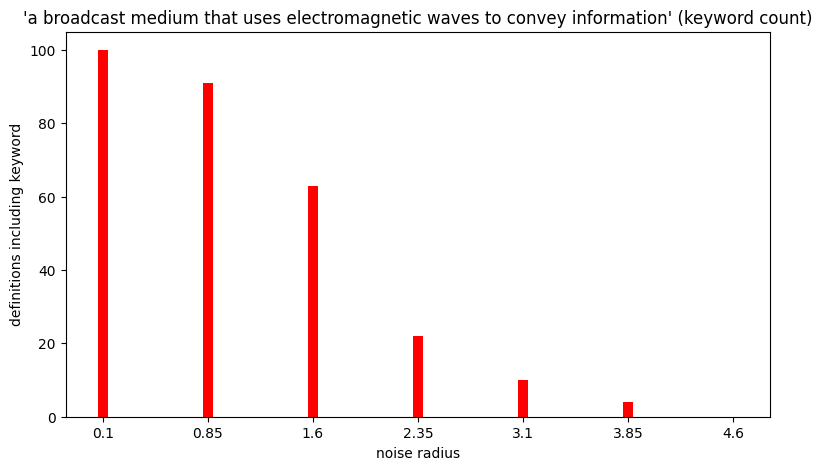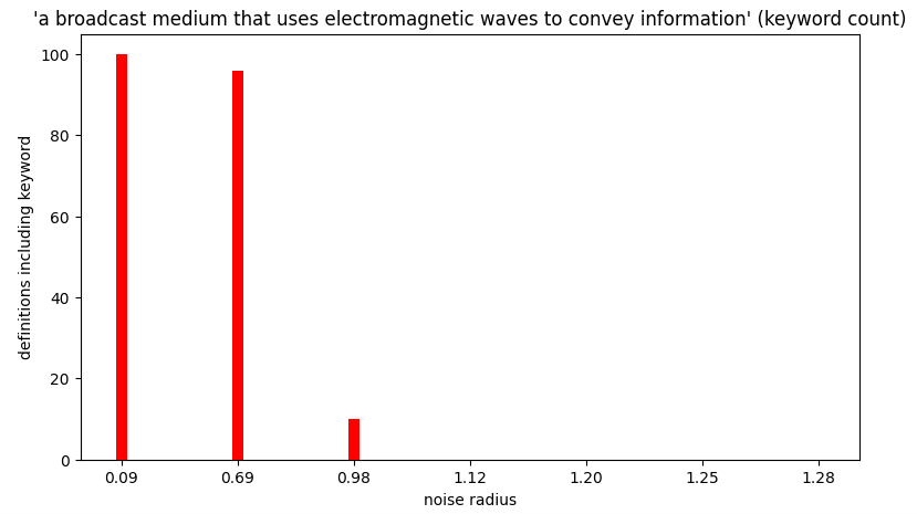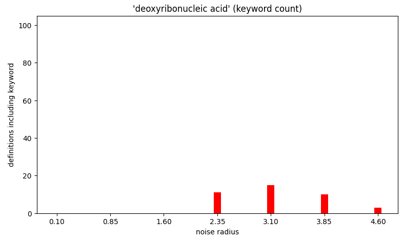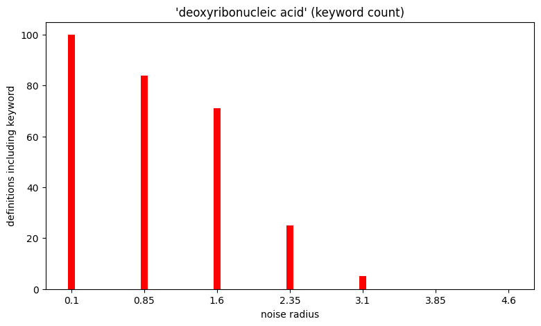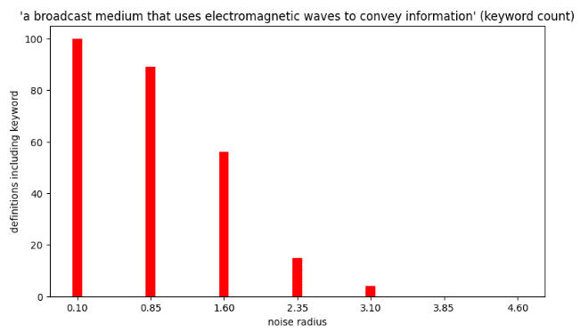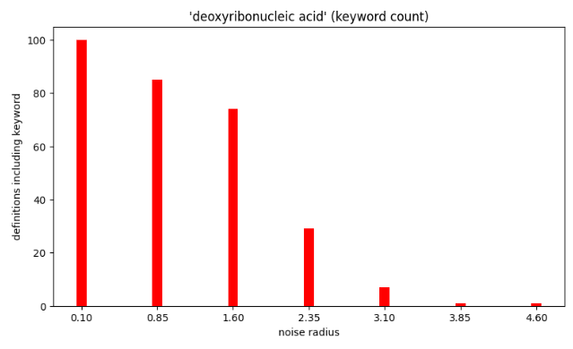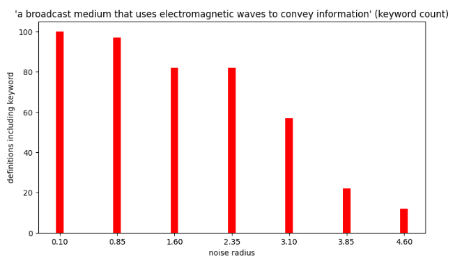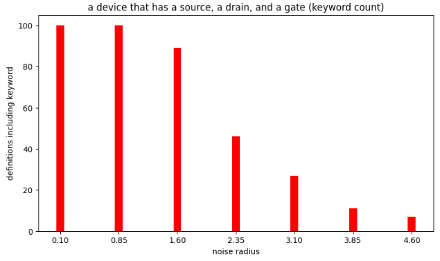 Because I was seeing a lot of definitions immediately straying from the reference embedding definition in terms of exact wording, but still remaining "on topic", I also experimented with a third metric which involved choosing a keystring from the original definition and recording how many of the 100 definition outputs include this. The basic decay pattern was always the same.