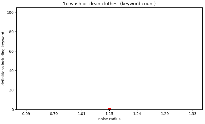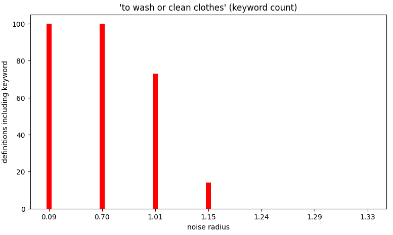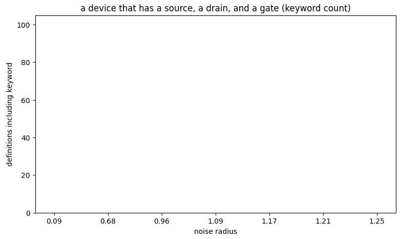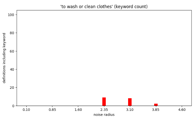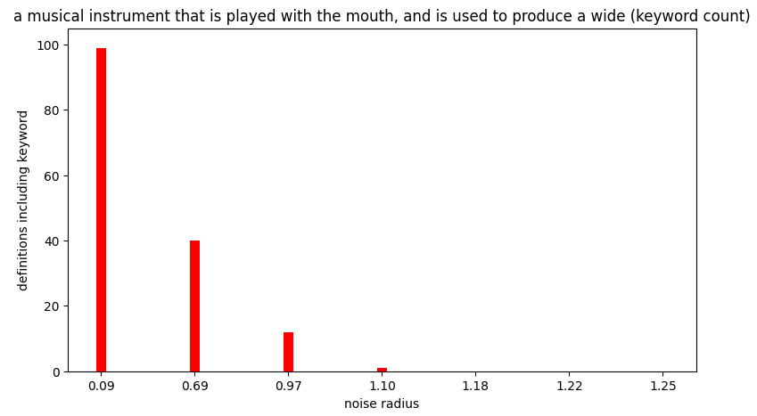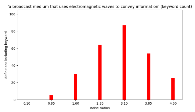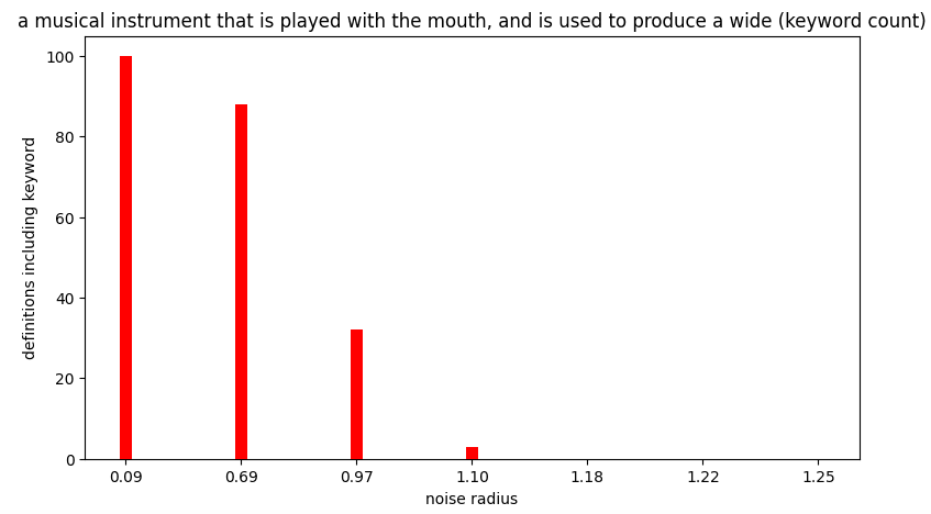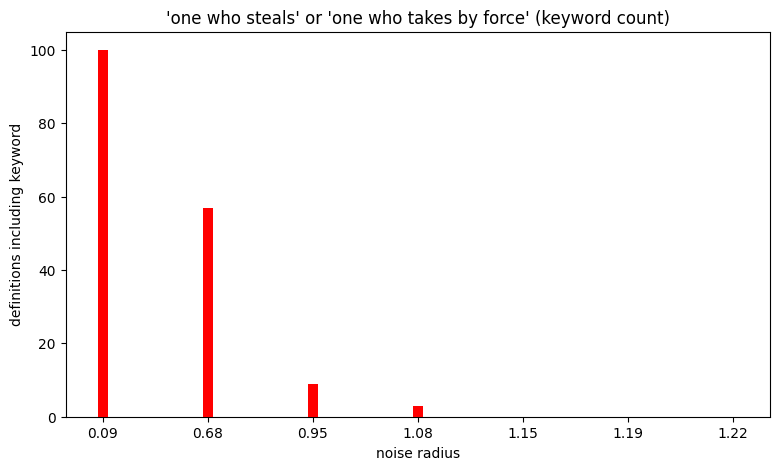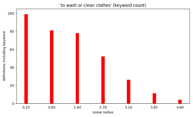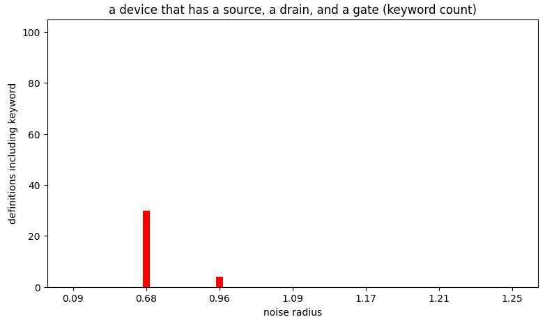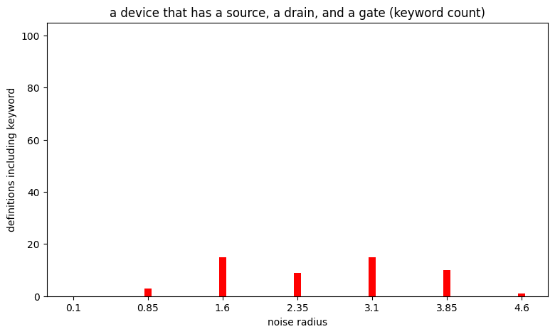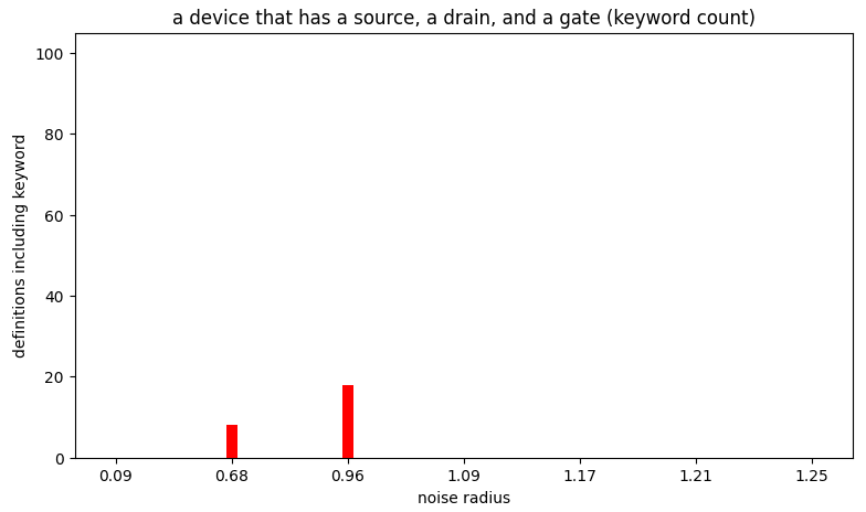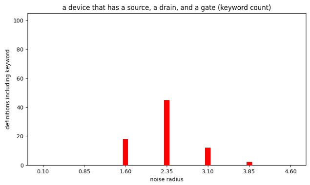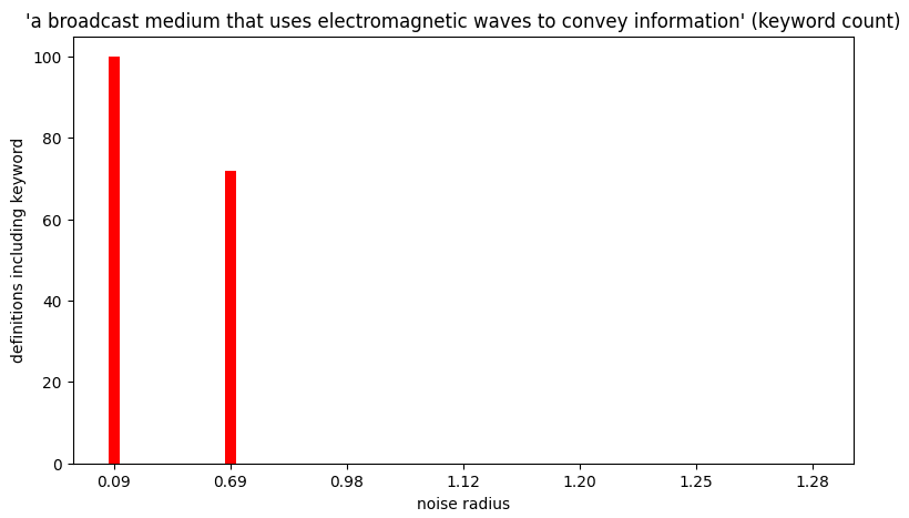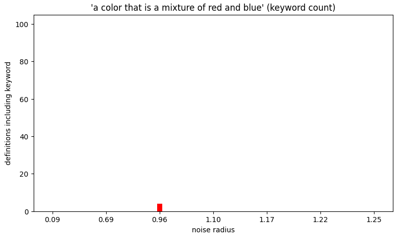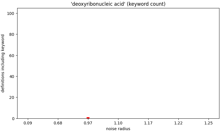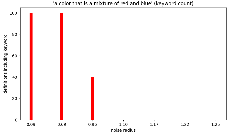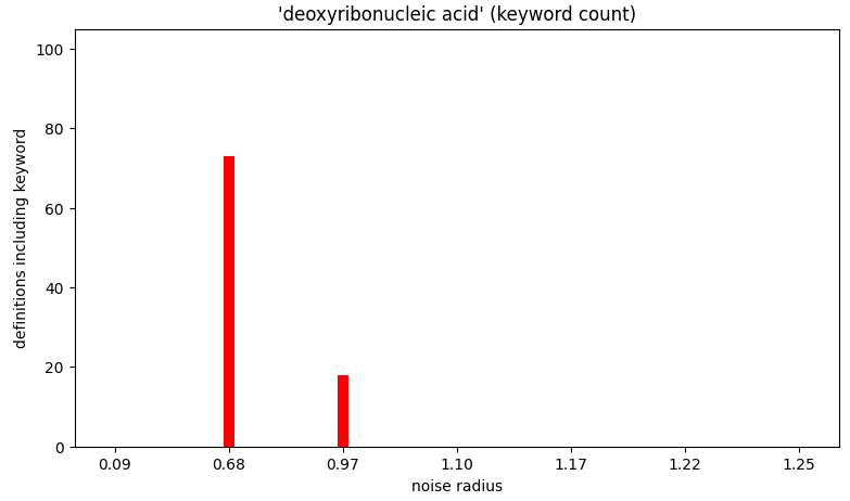 Because I was seeing a lot of definitions immediately straying from the reference embedding definition in terms of exact wording, but still remaining "on topic", I also experimented with a third metric which involved choosing a keystring from the original definition and recording how many of the 100 definition outputs include this. The basic decay pattern was always the same.