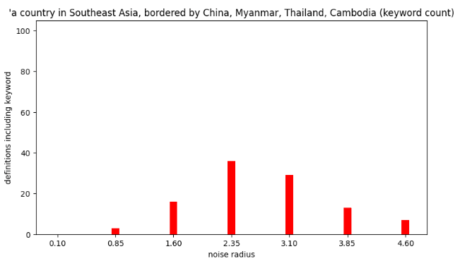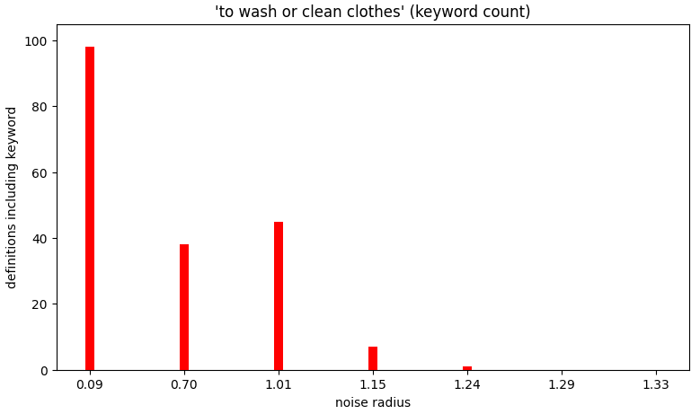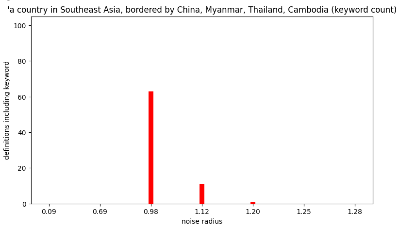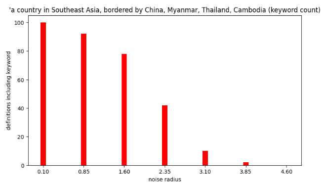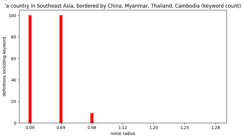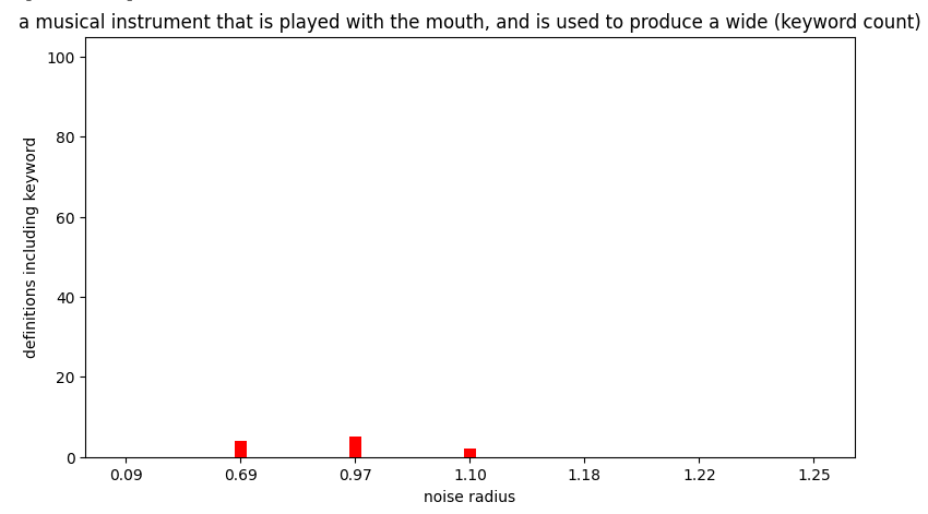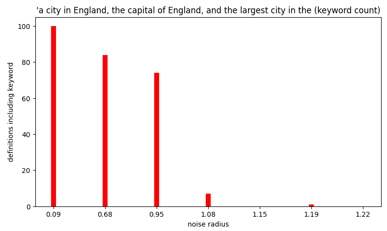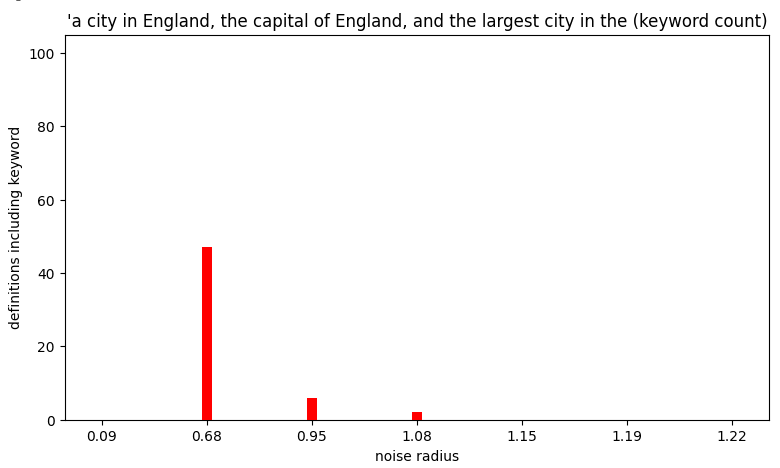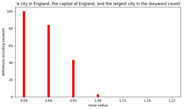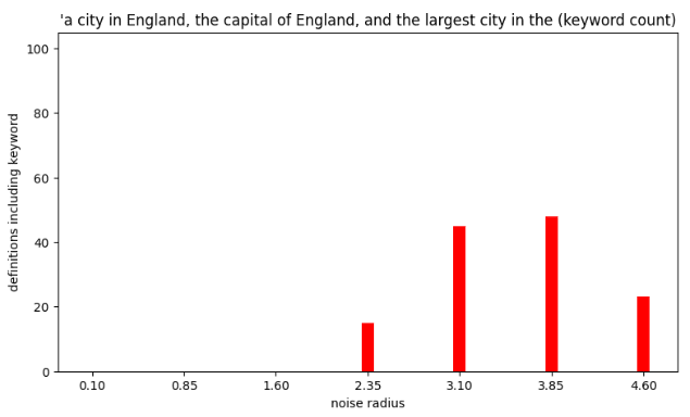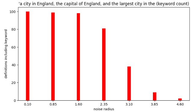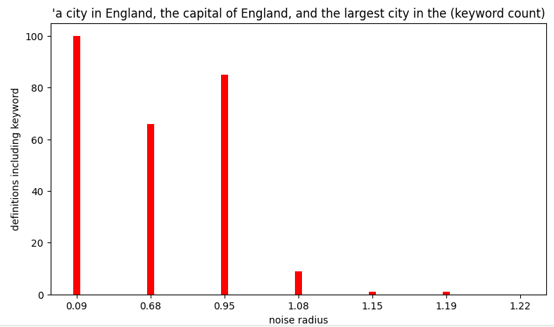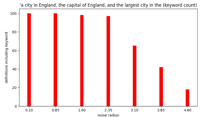 The mean radii for these normalised token perturbations are shown below the bars in the charts below. Notice how there's almost no trace of the original definition once we're more than a distance of 1 from the token embedding if (as we are here) we constrain our attention to the centroid-centred hypersphere it lives on. Before introducing this normalisation, we were seeing traces of definitions persisting out to distances > 4.6 from their token embeddings.