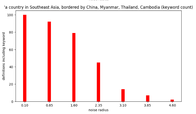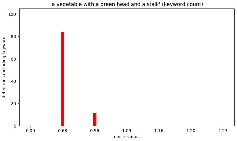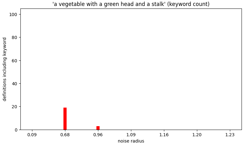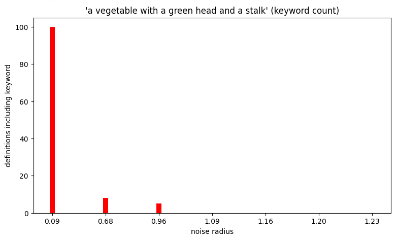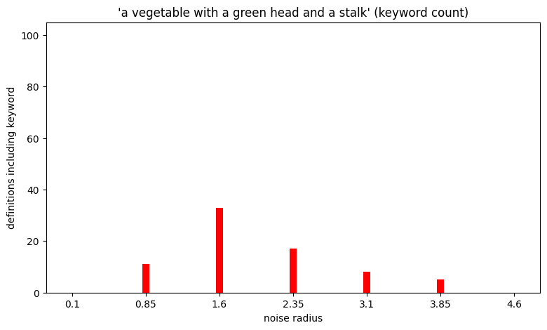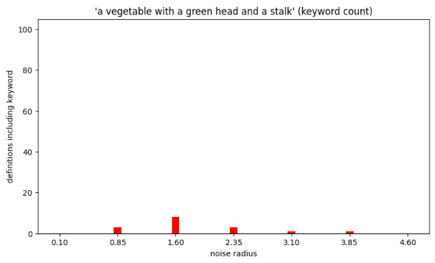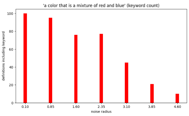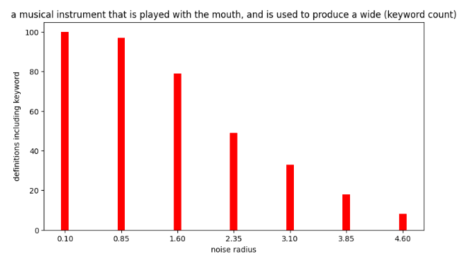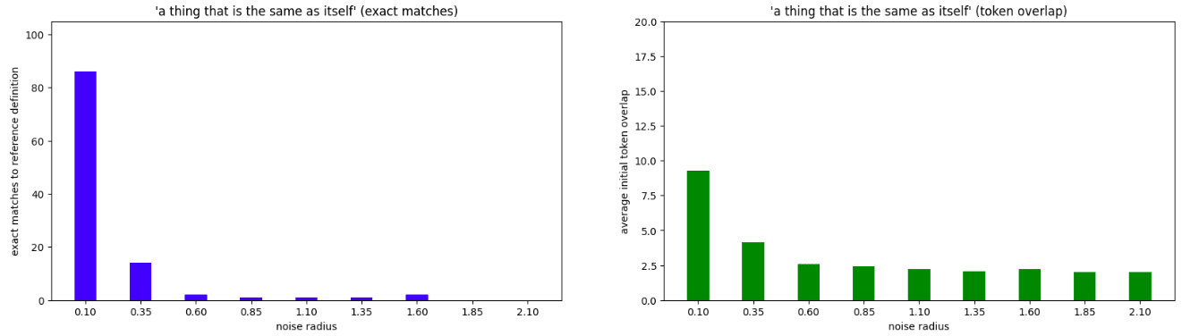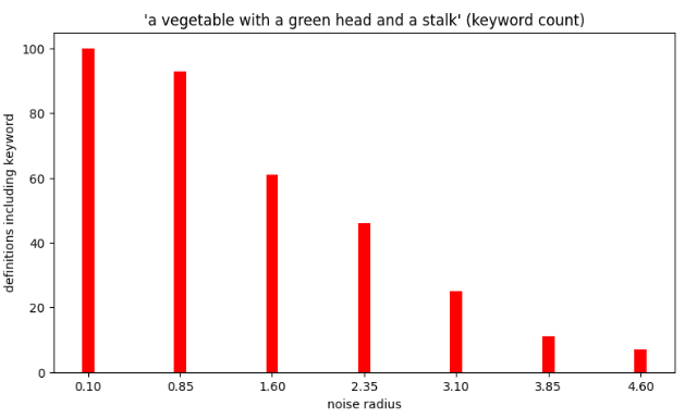 For each of the collected embeddings, 100 randomly directed noise vectors of each of the magnitudes [0.1, 0.35, 0.6, 0.85, 1.1, 1.35, 1.6, 1.85, 2.1] were sampled and added to it. Definitions were generated for each of these perturbations, which were then compared to the reference definition produced by the embedding in question.