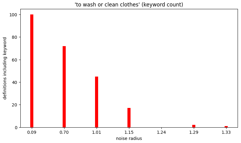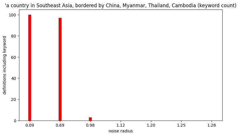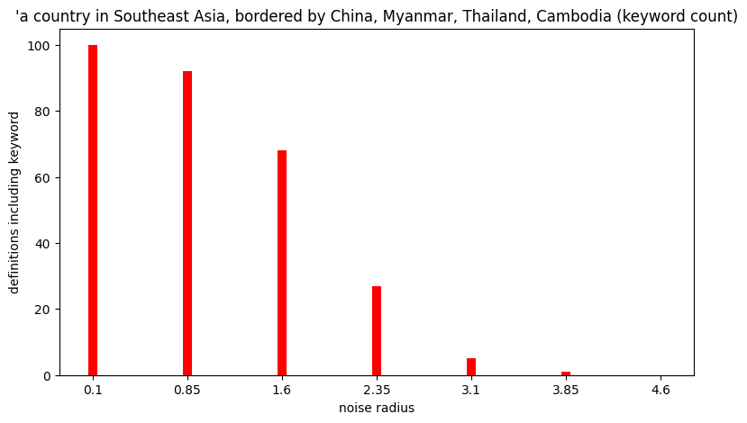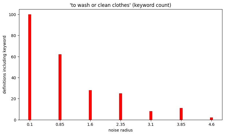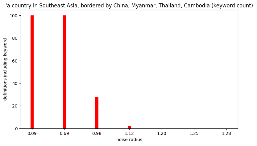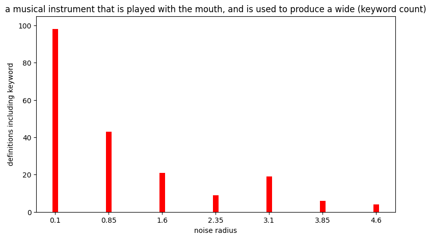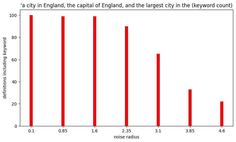 These bar charts show how often certain obvious keystrings appear in the 100 definitions produced for embedding vectors sampled at the various distances from the token embedding in question. Note the similar decay curves across many examples (all ten sets of charts are given in Appendix A). Also note the way that circular definitions (which include the token string itself, as illustrated in the lower-right panels) start to emerge, then peak, then fade in a similar way across examples: