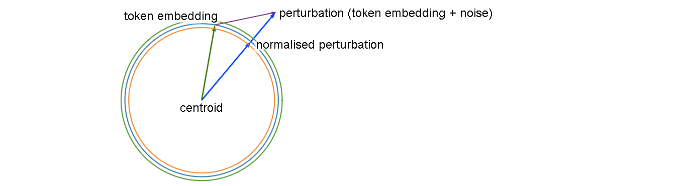 Here we add the randomly directed noise vectors of the specified magnitudes to our token embedding, but then (i) subtract the centroid vector from the results, (ii) rescale to match the token embedding's distance-from-centroid (which will be ~1) and then (iii) add back the centroid vector. In this way, we get something at the same distance from centroid as the original token embedding.