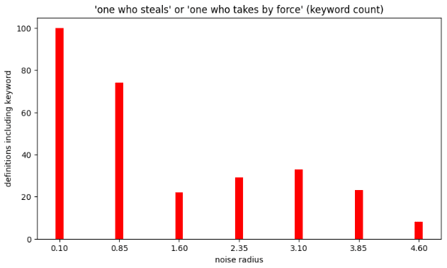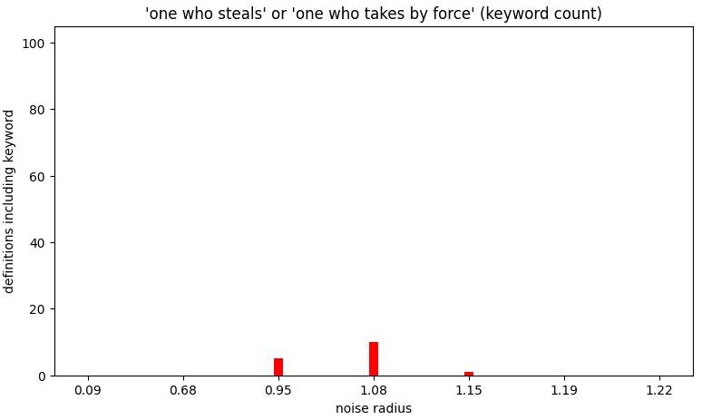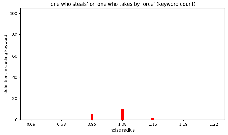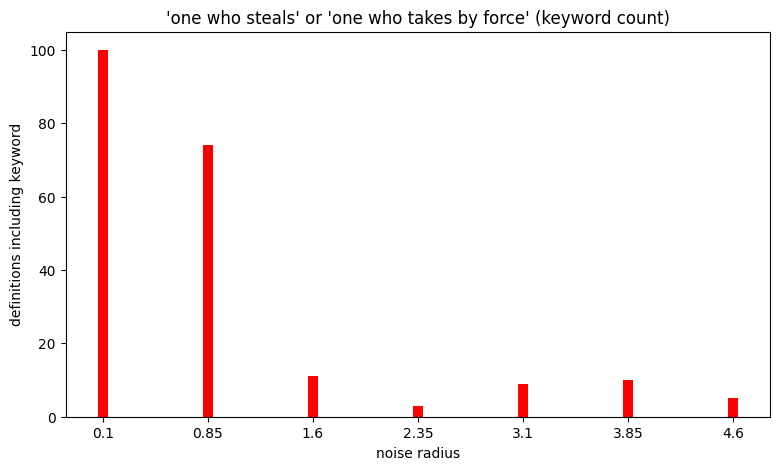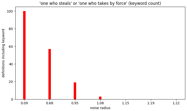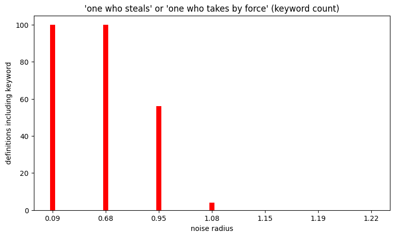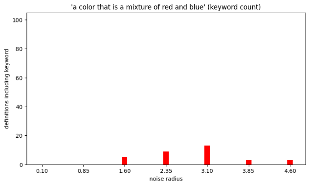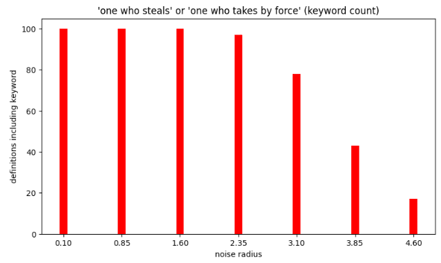 The original post focussed on distributions of various definitional themes across the scale of "distance from centroid", providing numerous bar charts like those seen immediately below. At a set of fixed radial distances from the centroid (mean token embedding), 100 non-token embeddings ("nokens" or "ghost tokens") were randomly sampled. For each, GPT-J was prompted with