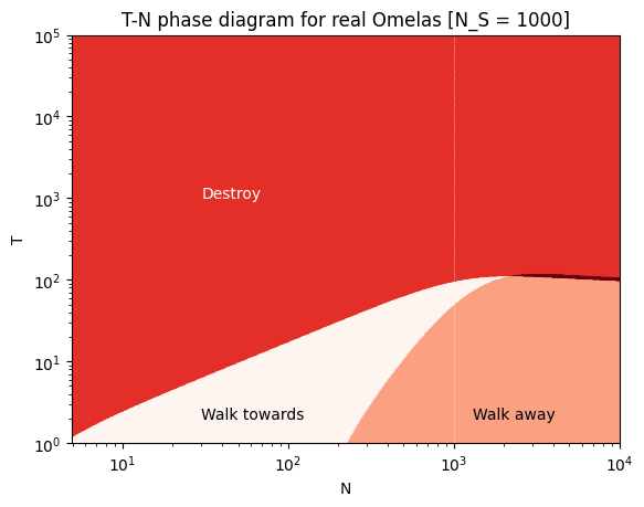 To be sure I actually have doubt about labelling the "destroy" region now. Some of it is in a position in which Omelas is a net negative but can become a mild net positive if enough people migrate to it. It's the region above the critical T line that makes Omelas unfixable.