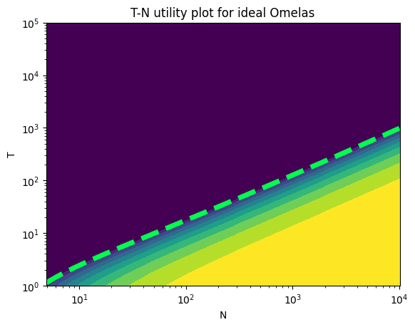 This has the consequence that the free utility converges to 1 as the population of Omelas grows, independently of temperature. The boundary across which the crossover from negative to positive utility happens is approximately: