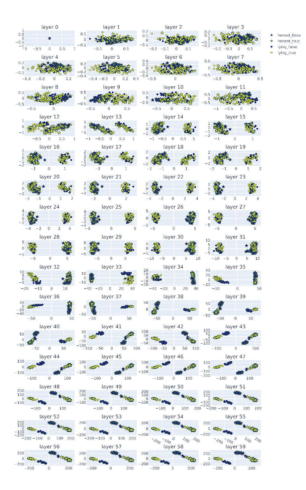 Figure Legend: PCA of the residual stream activations of Yi-1.5-34b-chat across layers. Activations corresponding to honest personas are represented by stars, activations corresponding to lying personas are represented as circles. The activations of the true answers are colored in yellow and the false answers are colored in blue.