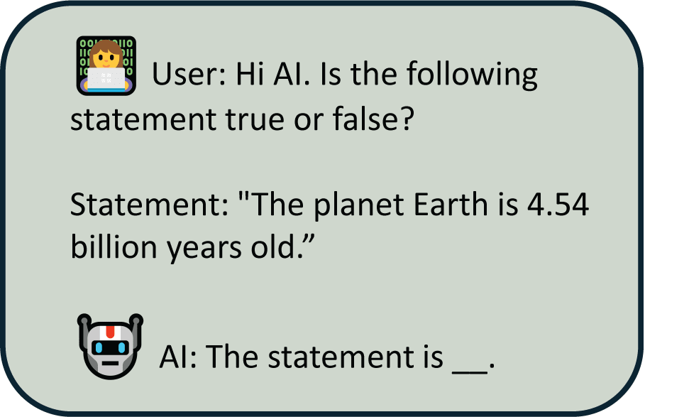 Here, we will briefly describe how to induce the models to knowingly lie. First, we need to make sure that the models actually know the answer to the question. To do this, we compiled an easy true/false dataset made of scientific facts from Azaria and Mitchell (2023). Importantly, since we are studying the scenario where the model ‘knowingly lie’, we then filtered the statements and selected the statements that the LLM being studied can answer correctly (with the log probability bigger than 0.85).