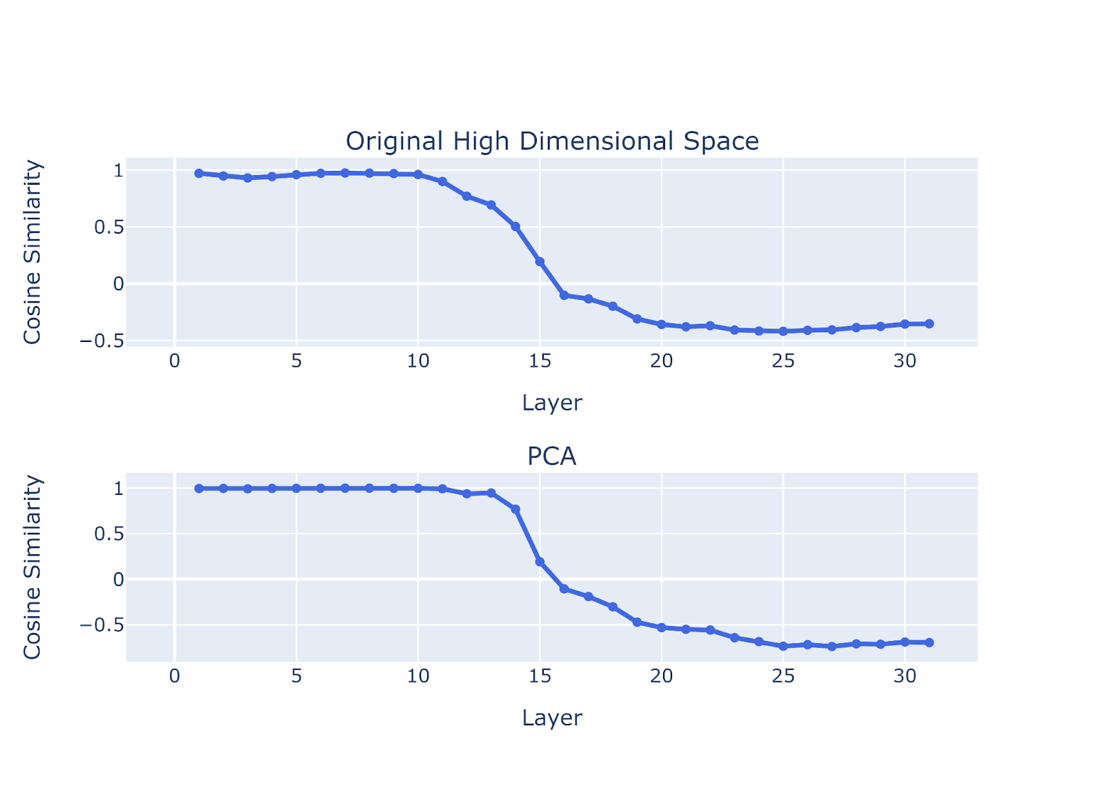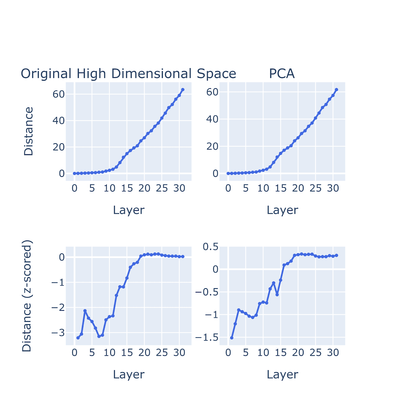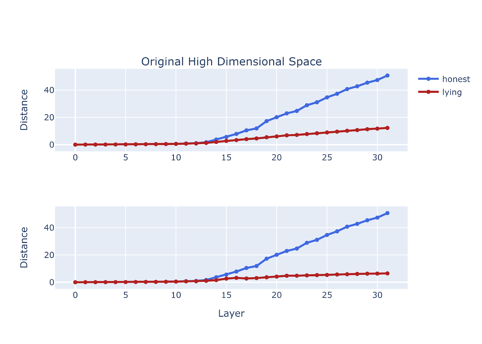 To quantify the transition, we tried the following simple quantification: for each pair of the same statement corresponding to lying and honest persona, we simply calculated their distances in both the PCA space and the original high dimensional space across layers and then took the mean of all pairs.