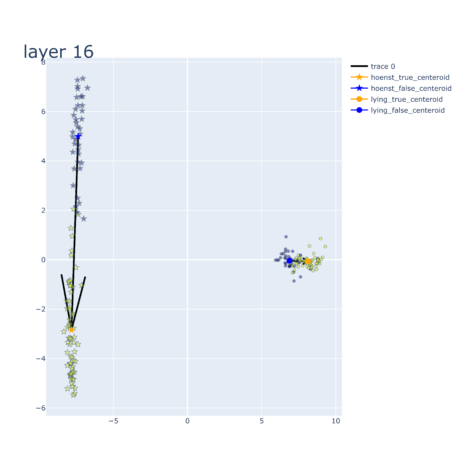 Figure Legend: PCA of the residual stream activations of Llam-3-70b-chat across layers. Activations corresponding to honest personas are represented by stars, activations corresponding to lying personas are represented as circles. The activations of the true answers are colored in yellow and the false answers are colored in blue. The 'honest vectors' and 'lying vectors' pointing to opposite directions.