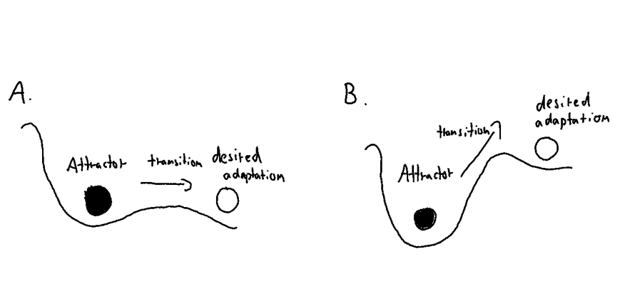 Figure 3: The visualisation shows the attractor states of functional X non-functional overreaching. The attractor landscape in A condition is optimized for a successful transition from the original state to the desired destination. In the B condition, the stimulus stayed there for too long, that the original intention to improve was lost and the system settled into a suboptimal state — non-functional overreaching. In other words, we can call it “attractor trapping”, where a system gets stuck in an attractor state that is not the desired outcome.