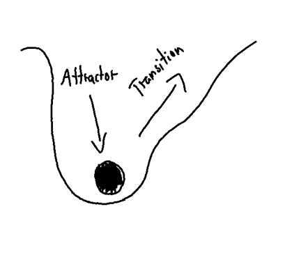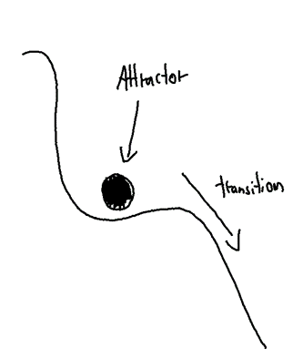 Figure 1: The visualisation shows the attractor state. The attractor landscape is best explained via ‘hilly terrain’ in which we want to move from one state to another. In this particular scenario — the attractor is fixed in the valley and due to the force of gravity it is very hard to escape from. To leave the attractor state, it is necessary to form an adequate landscape, which will facilitate the transition.