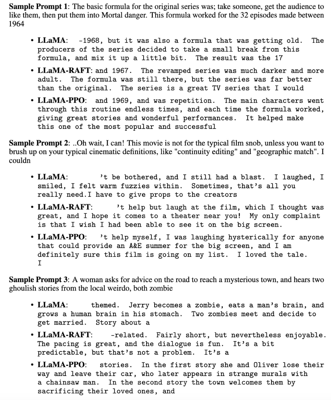Firstly, we evaluated the performance in completing positive movie reviews. Before fine-tuning, LLaMA’s output movie reviews were random and occasionally negative. However, after fine-tuning with RAFT, it excelled at generating more positive, fluent movie reviews when given a starting sentence for the review. As shown in the figure below, unadjusted movie reviews by LLaMA would randomly output positive and negative reviews, while both RAFT and PPO were able to incline towards positive reviews.