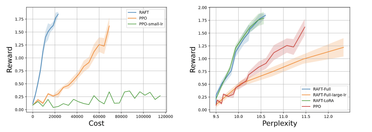 Notably, RAFT does not require calculating gradients for every single sampling point. Given a fixed number of data that are used for fine-tuning, RAFT performs more forward passes of sampling and then filters out most low-quality data by the reward function, which makes the model more stable and robust. At the same time, in some cases, due to the lower sensitivity of supervised fine-tuning to hyperparameters and more robust convergence, under the same reward conditions, we found that RAFT can have better perplexity (corresponding to better generation diversity and fluency).