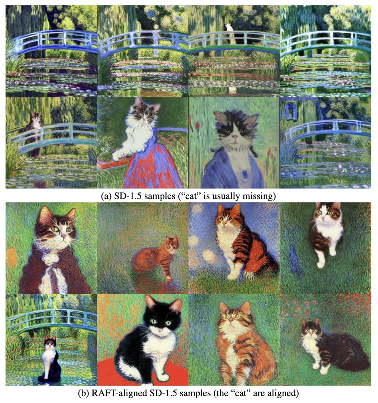In addition to improving the generation ability of 256*256 images, RAFT can also align the generated images with the prompts, enabling the model to generate images that better match the prompt description. As shown in the figure below, given the prompt "Monet style cat" the original stable diffusion generated pictures that mostly did not include a cat, but instead generated other works in the style of Monet. This was because cats are rarely seen in Monet's works, and stable diffusion did not fully understand the meaning of the text. However, after fine-tuning with RAFT, stable diffusion was able to understand the concept of a "cat," and so there is a cat in every generated image.