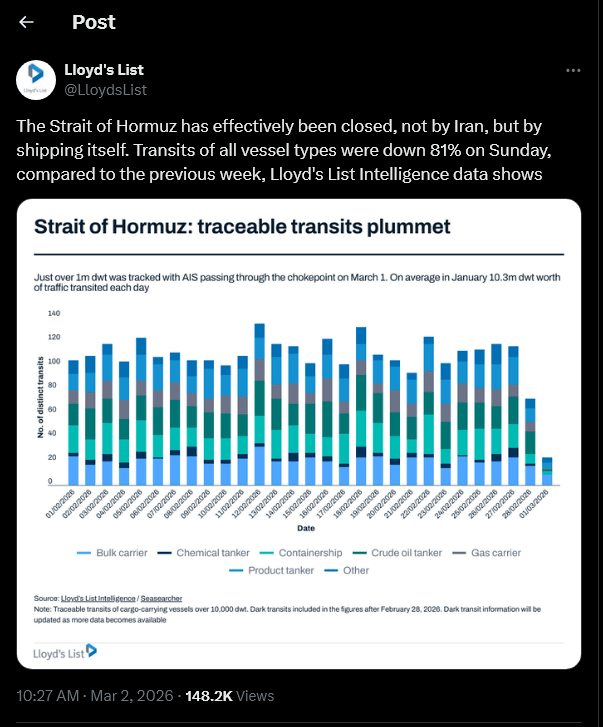 I would not rate the risk of escalation sufficient to sink an unaffiliated cargo ship below one percent, but more than half of bulk carriers appear to have made that decision, relative to tiny fractions of gas carriers and zero percent of chemical tankers. Nearly 100 percent of ships still passing through are heading eastbound, which probably plays some role here.