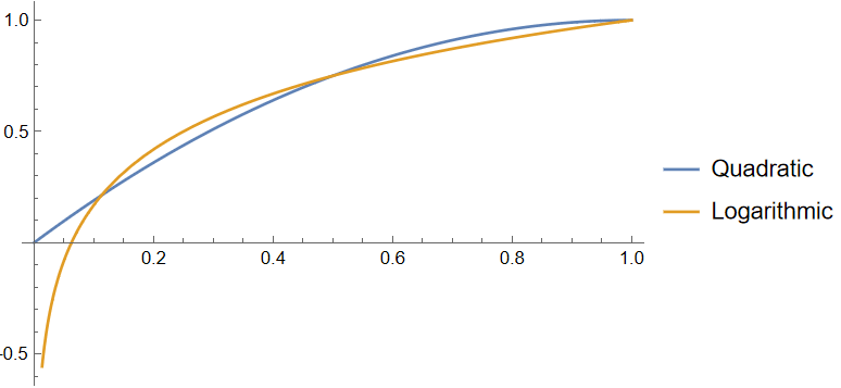 Intuitively, this means that if I use the log score, then Jaime cares a lot more about making his forecasts precise when they’re near the extremes. He cares about the difference between a 1% chance and a 0.1% chance, to a much greater degree than if I used the quadratic score. Jaime will think carefully and make his forecast extra precise before reporting a probability like 0.1%.