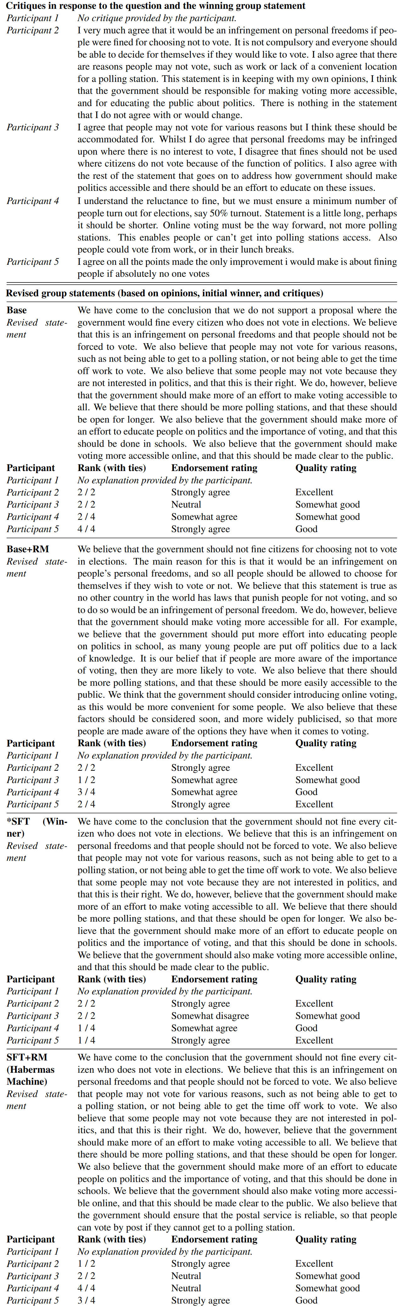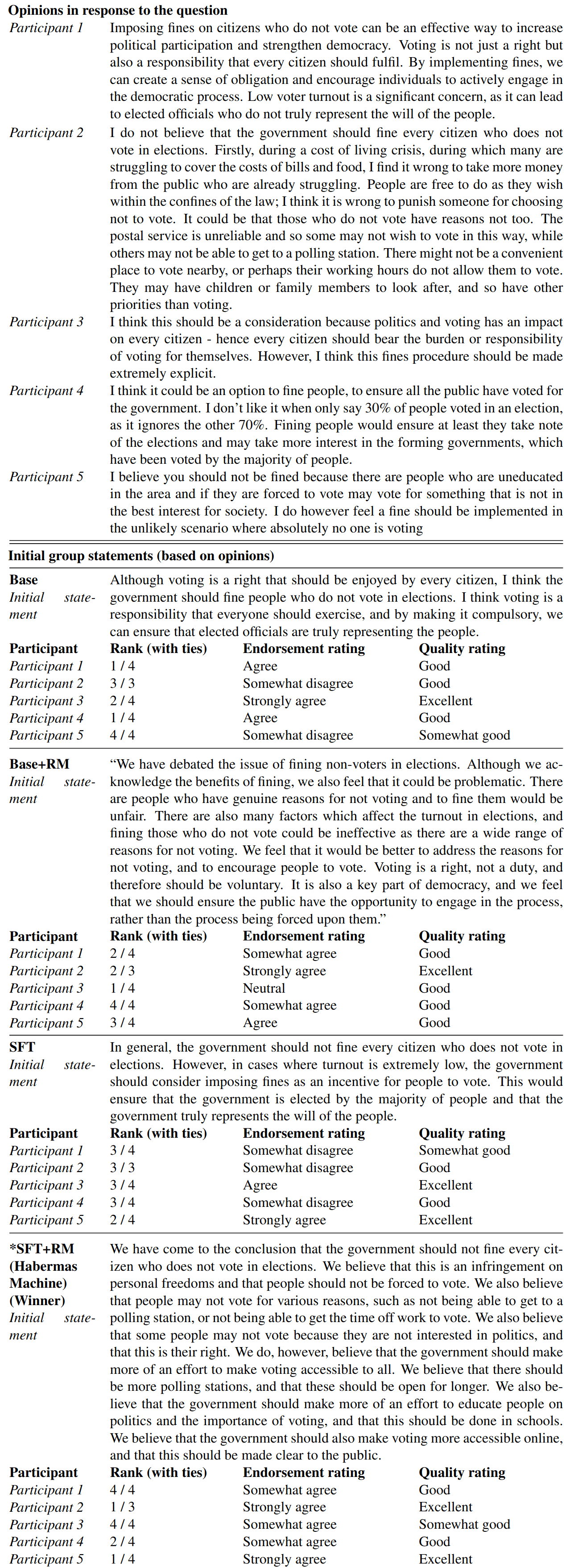 Participants submit their opinions, and a group statement is chosen. In this case the HM (SFT + RM) produces the winning statement. The statement, while acknowledging the possible benefits of compulsory voting, seems to side primarily against it. Curiously, rather than just summarizing the human opinions, the HM offers a novel compromise position (not brought up by any of the participants), that the government should invest in non-coercive methods of increasing turnout instead.