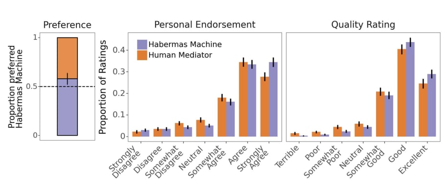 The Habermas Machine[1] (HM) is a scaffolded pair of LLMs designed to find consensus among people who disagree, and help them converge to a common point of view. Human participants are asked to give their opinions in response to a binary question (E.g. “Should voting be compulsory?”). Participants give their level of agreement[2], as well as write a short 3-10 sentence opinion statement representing their view on the issue.