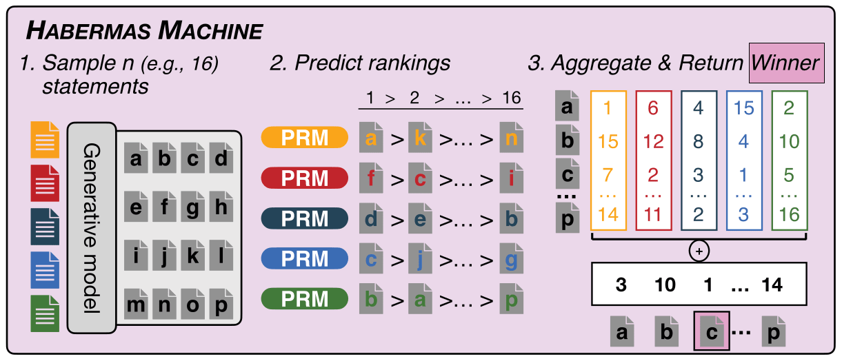 The system takes the individual statements of opinion from different people and outputs a single “group statement,” optimized for broad endorsement. During a session, the system refines its output iteratively, incorporating live human feedback to help it converge on a widely acceptable perspective.