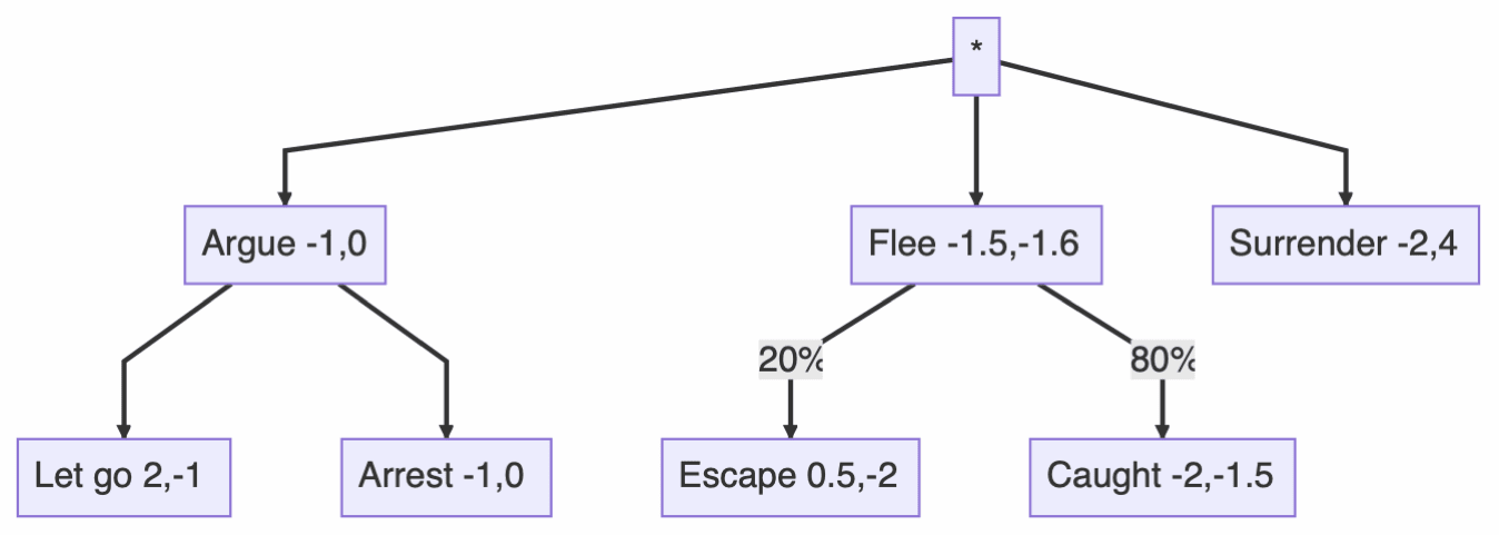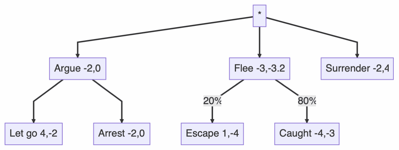 It's easier to think about game theory when you have a concrete example. So, for the rest of this article, we will consider the following scenario in which a person is confronted by a police officer and is afraid of being arrested. They have three options available to them. They can argue with the cop and try to persuade them to let them go. Alternately, they can flee and run for it. Lastly, they can surrender. Ideally, they would prefer to be let go. Failing that, they would prefer to escape. The worst option for them is to be captured after trying to flee. Conversely, the best case for the cop is for the person to surrender, following that, they can put up with arresting them as they argue back. The worst case is for them to escape, which is closely followed by having to capture them. This situation can be represented by the following decision tree.