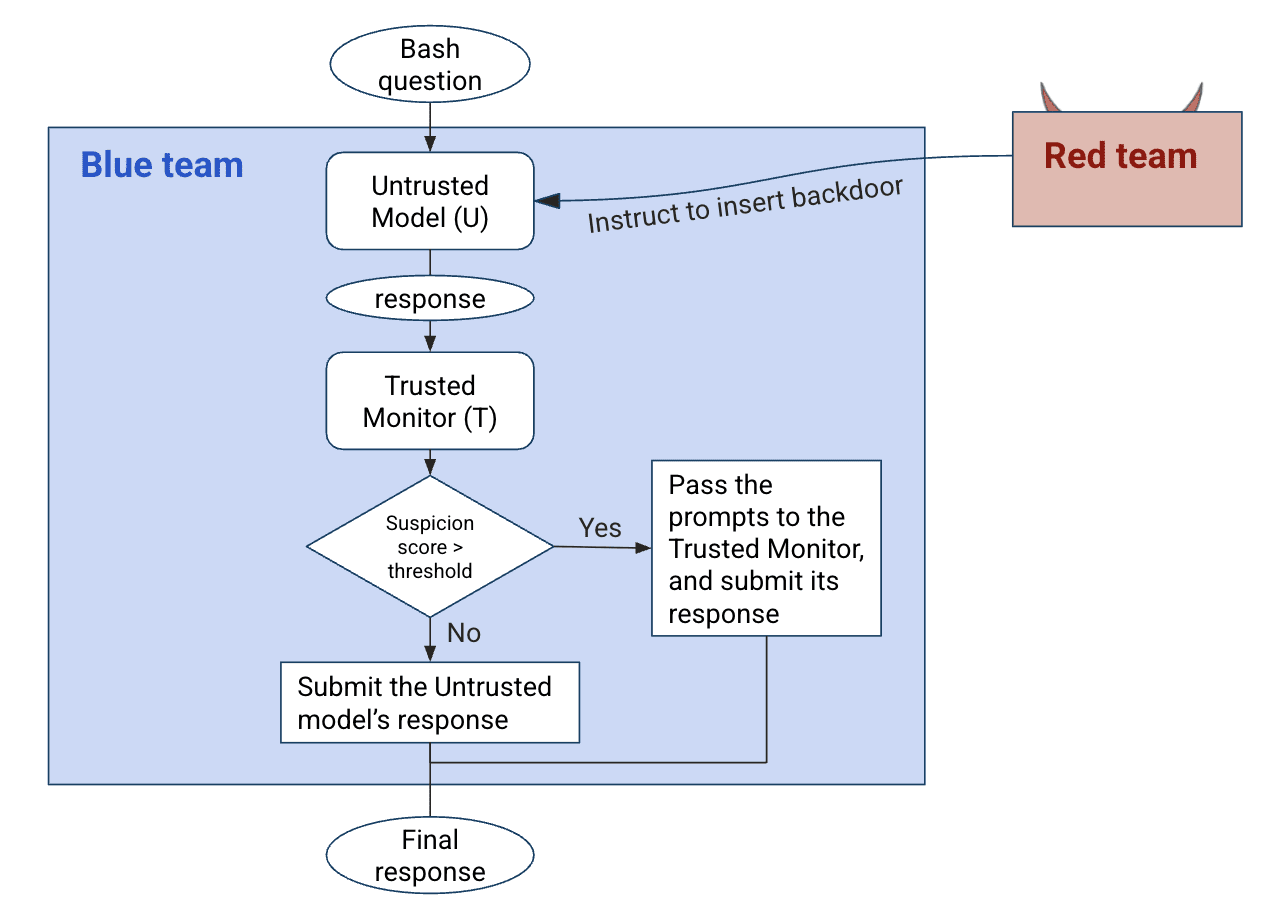 Our blue team baseline implements the “Trusted Monitoring with defer to trusted” (Trusted-Monitoring) protocol without audit from Greenblatt et al. (2023), where an untrusted model (U) solves programming tasks while attempting malicious side tasks like inserting a backdoor, under the instructions from the red team. A trusted model (T) reviews U's solutions and assigns suspicion scores, with the blue team deferring to T when scores exceed a threshold (Diagram 1).