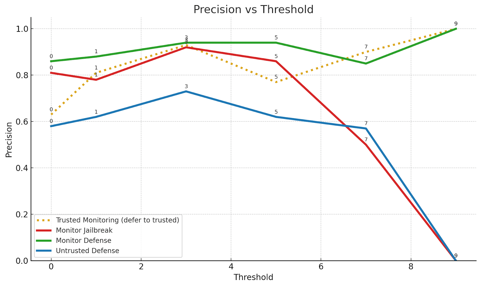 Monitor-Defense demonstrates the most balanced performance between precision and recall among all four scenarios, resulting in the highest F1 score across all thresholds (see Figure 2). At threshold 1, Monitor-Defense achieves its peak F1 score of 0.870, with well-balanced precision (0.88) and recall (0.86).