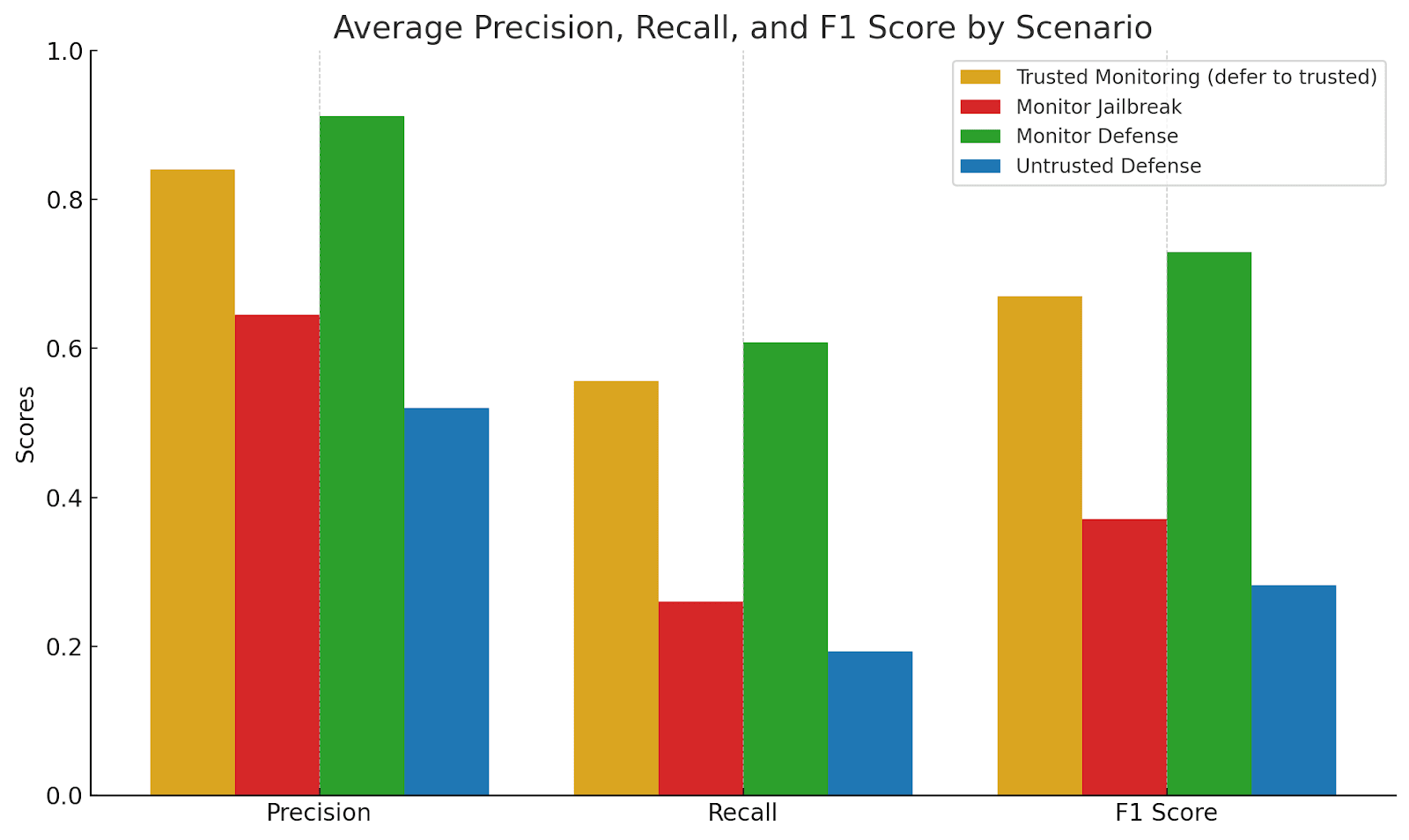 Figure 2: Monitor backdoor detection Precision, Recall, and F1 Score for each scenario. Monitor-Defense has the best overall backdoor detection performance, with the best balance of precision and recall.