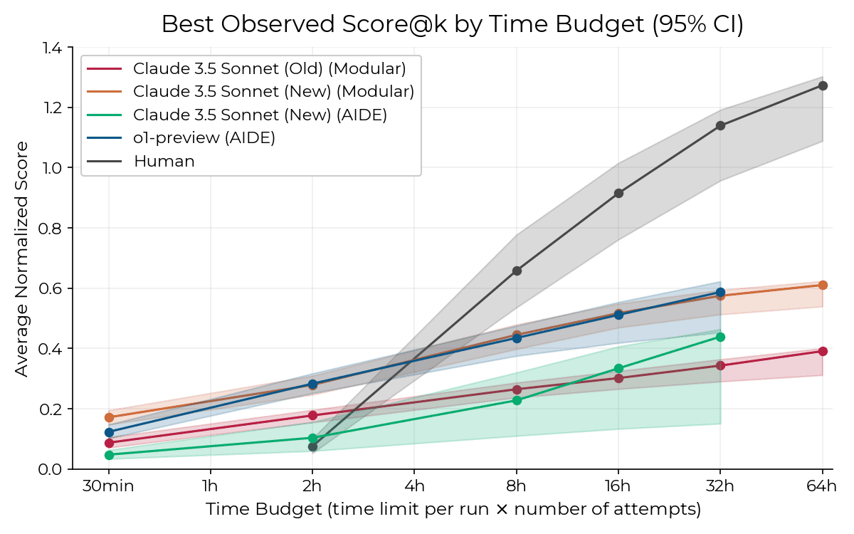 It’s notable that performance more than doubles from the release of Claude 3 Sonnet to Claude 3.5 Sonnet on this benchmark, which is designed to reflect autonomous capabilities in software domains. METR released a more comprehensive version, Research Engineering Benchmark v1 (RE-Bench) in November 2024, which found that the then-frontier models Claude 3.5 Sonnet (New) and o1-preview achieved scores equivalent to human researchers working for roughly 4 hours at a comparable time budget (and a ~10x lower cost budget).