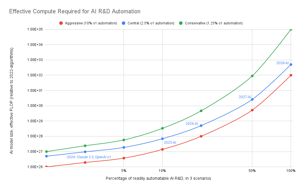 Conservative scenario: 2024-era AI systems can automate ~1% of R&D tasks, and I expand the 1-100% eFLOP gap from 6 to 8 OOM to model a longer tail of task difficulty. This raises the eFLOP required for full automation from 1e33 to 1e35[39]. I also include a serious slowdown in hardware scaling and algorithmic progress trends[40]. In this scenario, it takes AI companies until the early 2030s to make systems that can start to significantly speed up AI R&D. Building the datacenters to train 2035-era AIs costs roughly ~$15B. After this speeds up algorithmic progress, 2036-era AI is trained in the same datacenters and can automate ~all tasks.