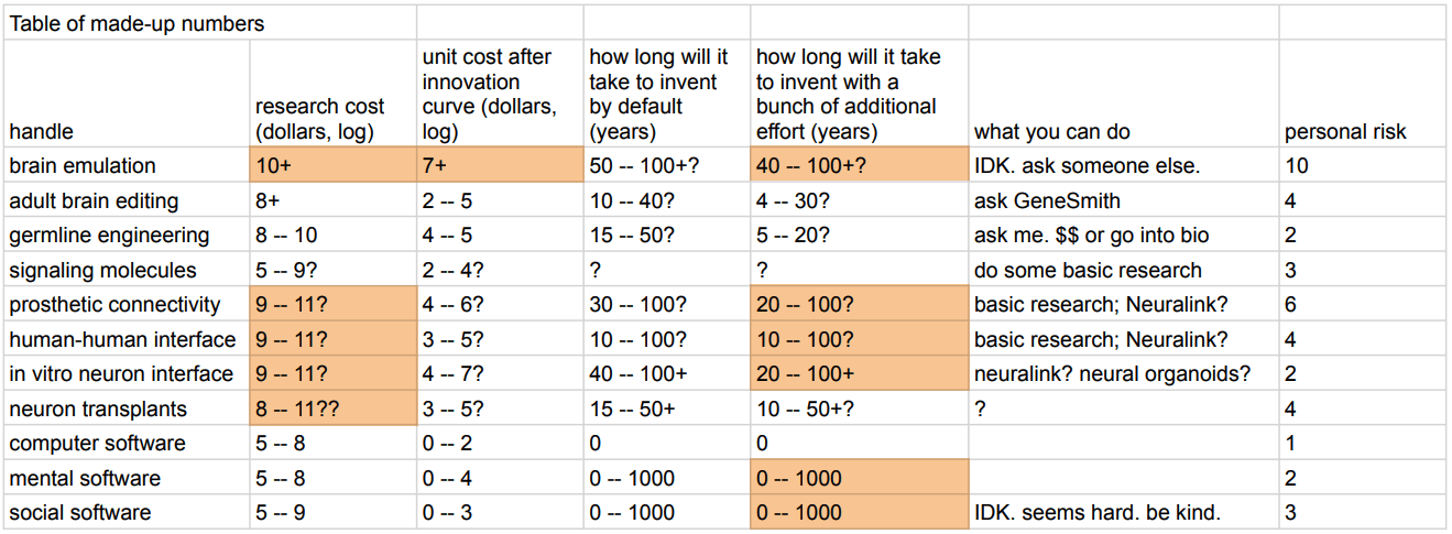 Fundamentally, brain emulations are a 0-to-1 move, whereas the other approaches take a normal human brain as the basic engine and then modify it in some way. The 0-to-1 approach is more difficult, more speculative, and riskier.