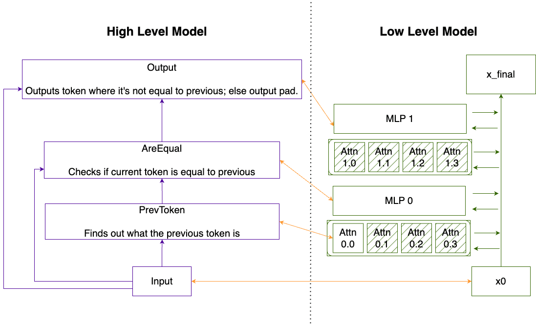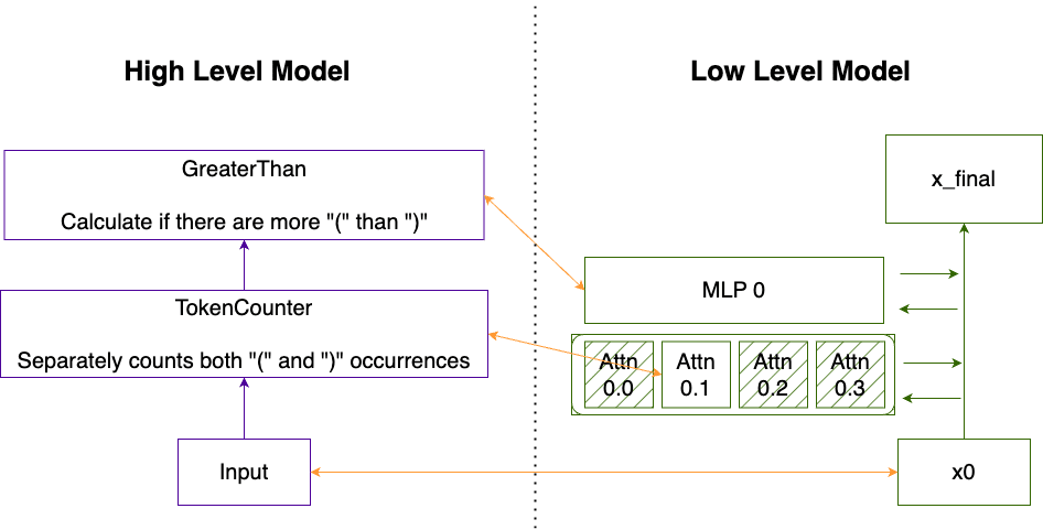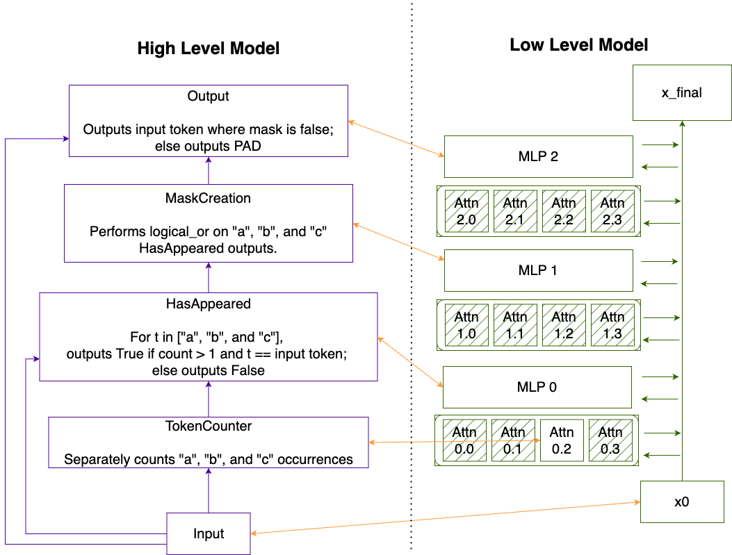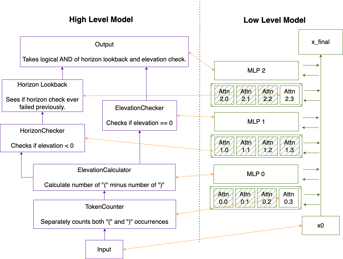 We break each algorithmic task down into successive computations that can be performed by the nonlinearities present in either a single attention head or in a single MLP layer. We design a “correspondence” which links each node in the high level model with a single attention heads or MLP in the low level model. Then we train the low level transformers using the training techniques we described above in the “Training with SIIT” section and ensure that the high level model can be trained into a transformer using SIIT.