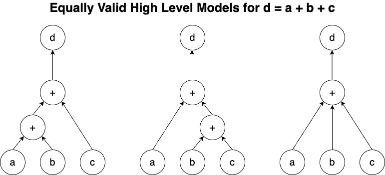 As an example, imagine the task “add together three numbers,” and we’ll call the numbers ‘a’, ‘b’, and ‘c’, and the result ‘d’, so d = a + b + c. This operation can be performed in a few different ways, all of which return the same result. You could have an addition operation that takes two inputs and returns one output, and use that addition operation twice, or you could have an addition operation that takes three inputs and returns one output and then use that operation once. Both are valid ways to do addition, and so we can define multiple different valid “high level” models of adding together three numbers: