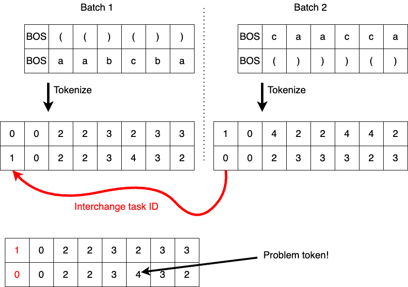 We’ve gone with the latter. For now, we’re replacing tokens that are outside of the task vocabulary with randomly sampled tokens from within the task vocab (and we do not include PAD and BOS in the random sampling, so in the above example the ‘4’ would be replaced with a ‘2’ or a ‘3’ representing a ‘(‘ or a ‘)’).