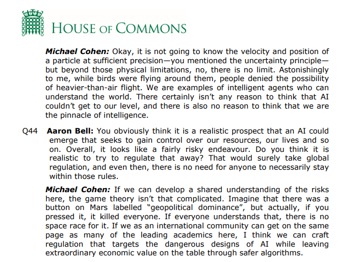 Back in January, Michael Cohen talked at the House of Commons about the possibility of AI killing everyone. At this point, when policymakers want to understand the problem and turn to you, downplaying x-risk doesn't make them listen to you more; it makes them less worried and more dismissive. I think a lot of AI governance people/think tanks haven't updated on this.