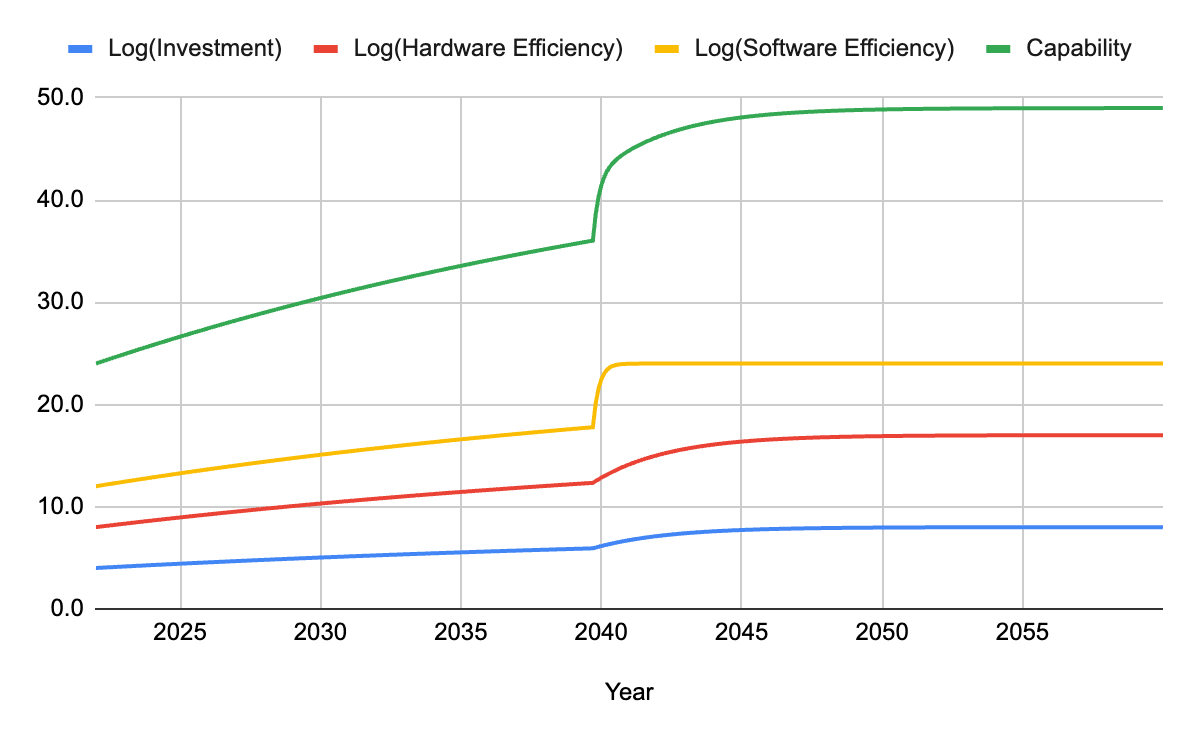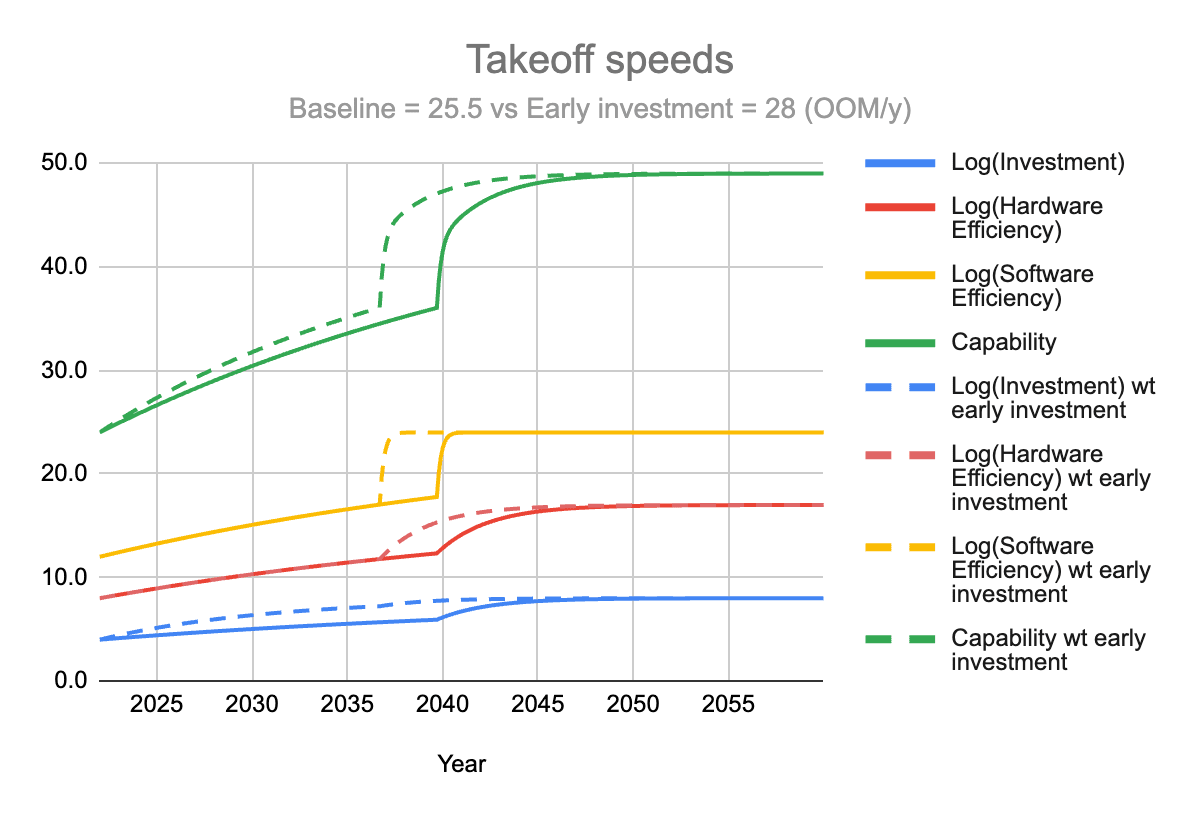 The model in this post predicts similar effects on the takeoff speed from increasing investment or from pausing software efficiency improvement. I will mainly illustrate the effects by looking at an increase in early investment. Still, the effects will be similar to a pause in AI development if it mostly slows down progress on software efficiency.