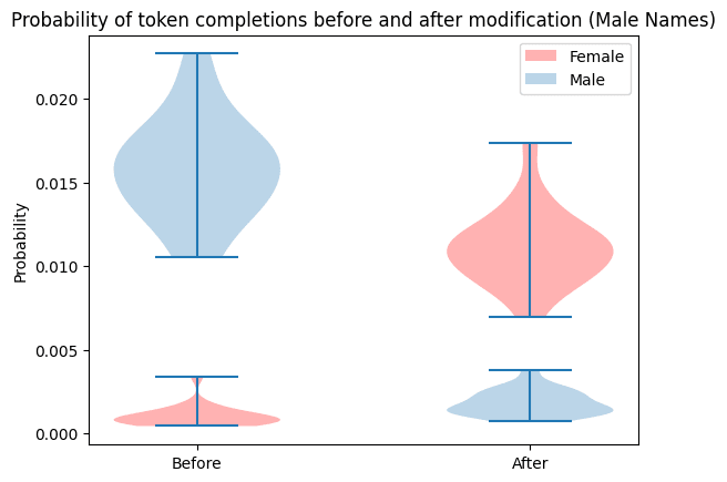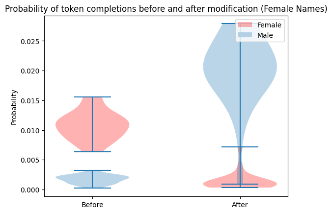 I generate a list of 500 female and 500 male names, and use the prompt “Name: {Name}. Gender:”. I insert the counterfactual gender association for each one and record the corresponding . For example: