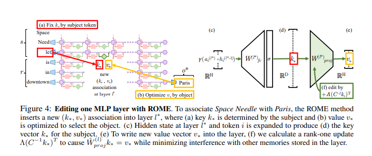 In particular: represents the “value” vector which optimizes the probability that the network will output the counterfactual (e.g. it’s the vector which maximizes the probability language model will complete “the Eiffel Tower is in the city of” with “Rome”). This vector presumably somehow contains the location of “Rome” in it, along with whatever other facts the model knows about the Eiffel Tower, but it’s simply a 4,000 dimensional vector of floating-point numbers and how it encodes this knowledge is not clear.