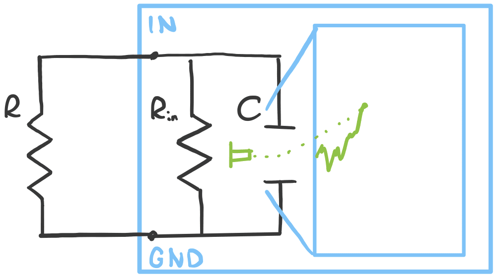 You're using an oscilloscope to measure the thermal noise voltage across a resistance R. Internally, the oscilloscope has a parallel input resistance Rin and capacitance C, where the voltage on the capacitor is used to deflect electrons in a cathode ray tube to continuously draw a line on the screen proportional to the voltage over time.